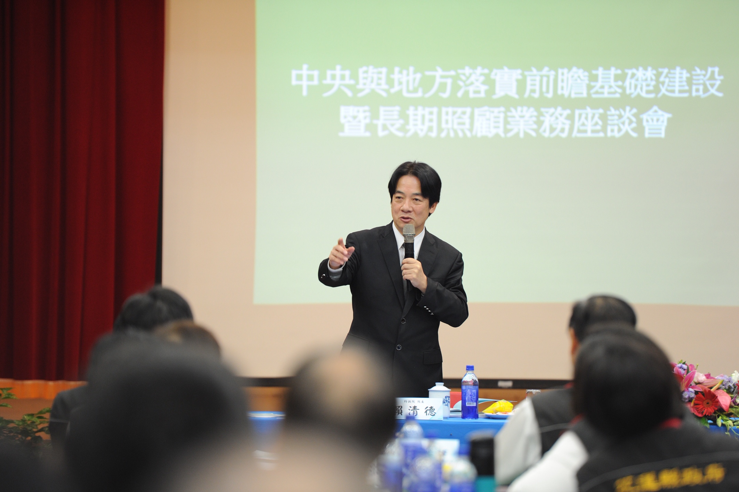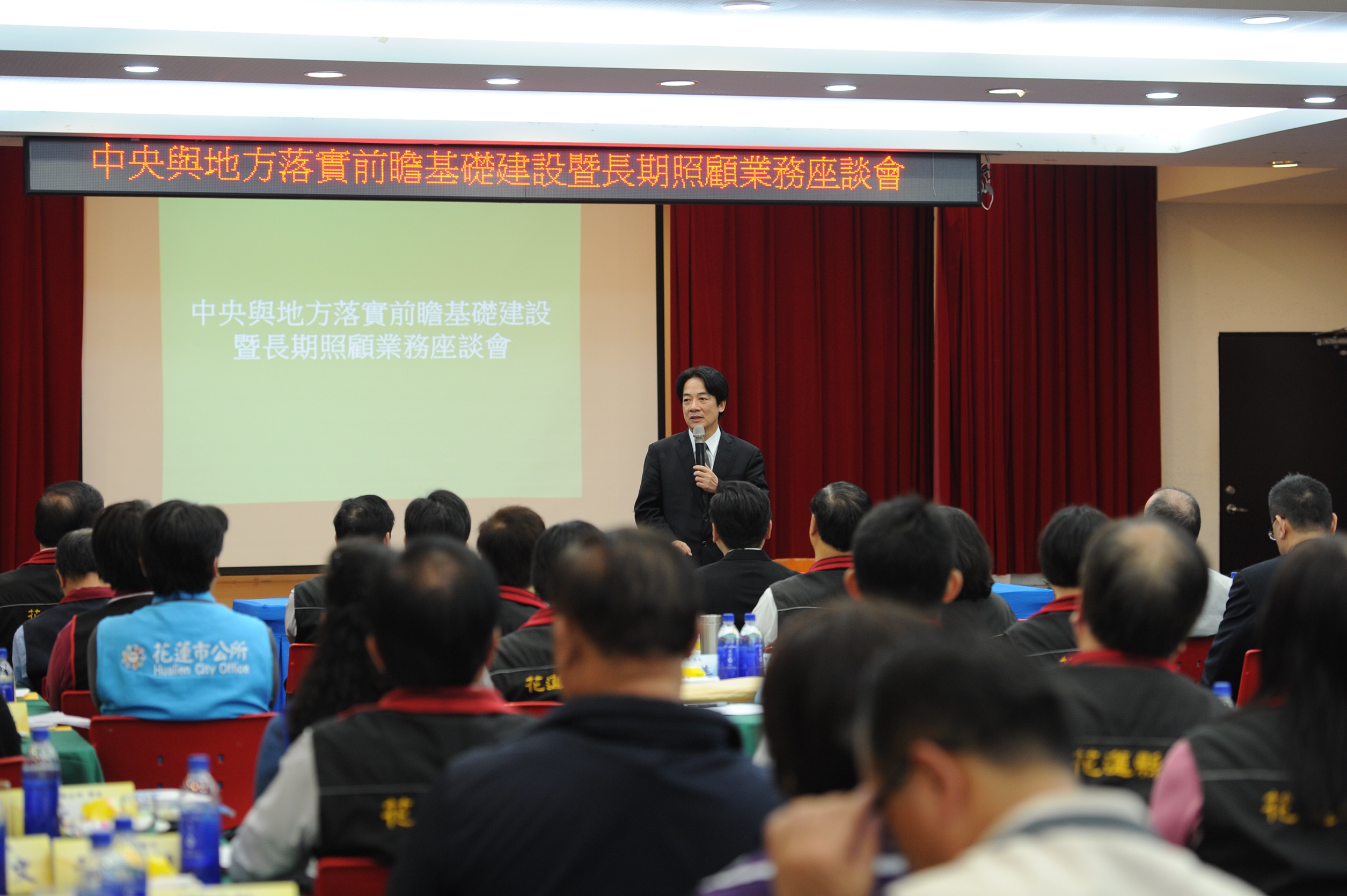 行政院長賴清德今(1)日率行政團隊至花蓮縣政府出席「中央與地方落實前瞻基礎建設暨長期照顧業務座談會」,與縣府局處首長、鄉鎮市長及地方民代面對面座談。賴院長表示,蔡英文總統特別指示行政院要落實推動「前瞻基礎建設」及「長照2.0」計畫,此行除希望尋求中央與地方的共同合作,讓重大政策推動,更具執行力及效果外,也期盼聆聽地方意見,共同解決問題。