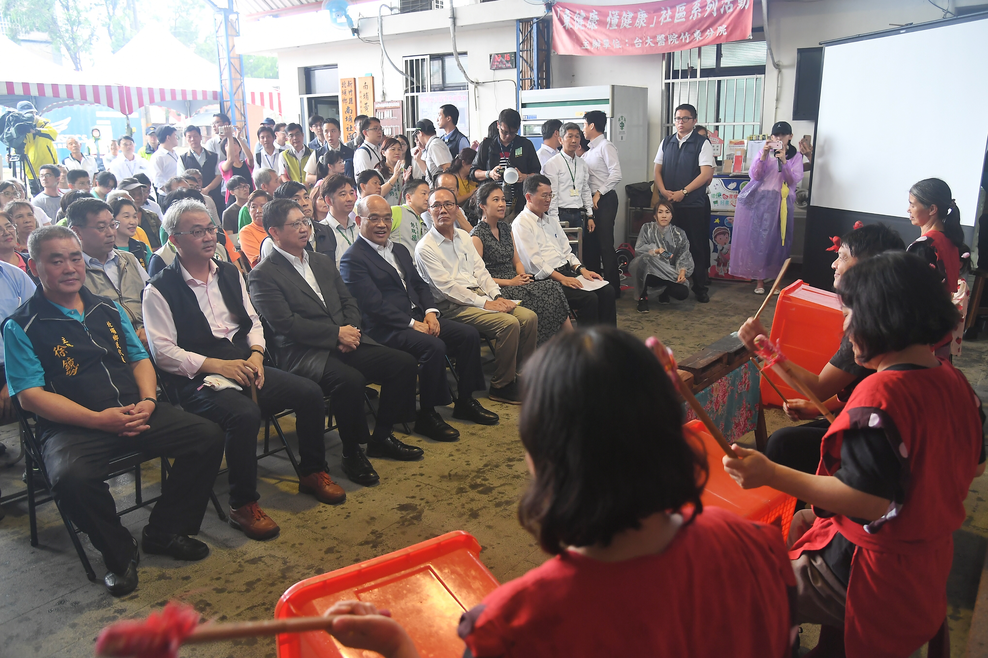 此行看見南埔「鹹菜桶打擊樂團」精彩的表演,對任何事物都充滿好奇的蘇院長,也探頭研究現場以廢棄香樟木作成的樂器,並即興來一段「打擊」體驗。