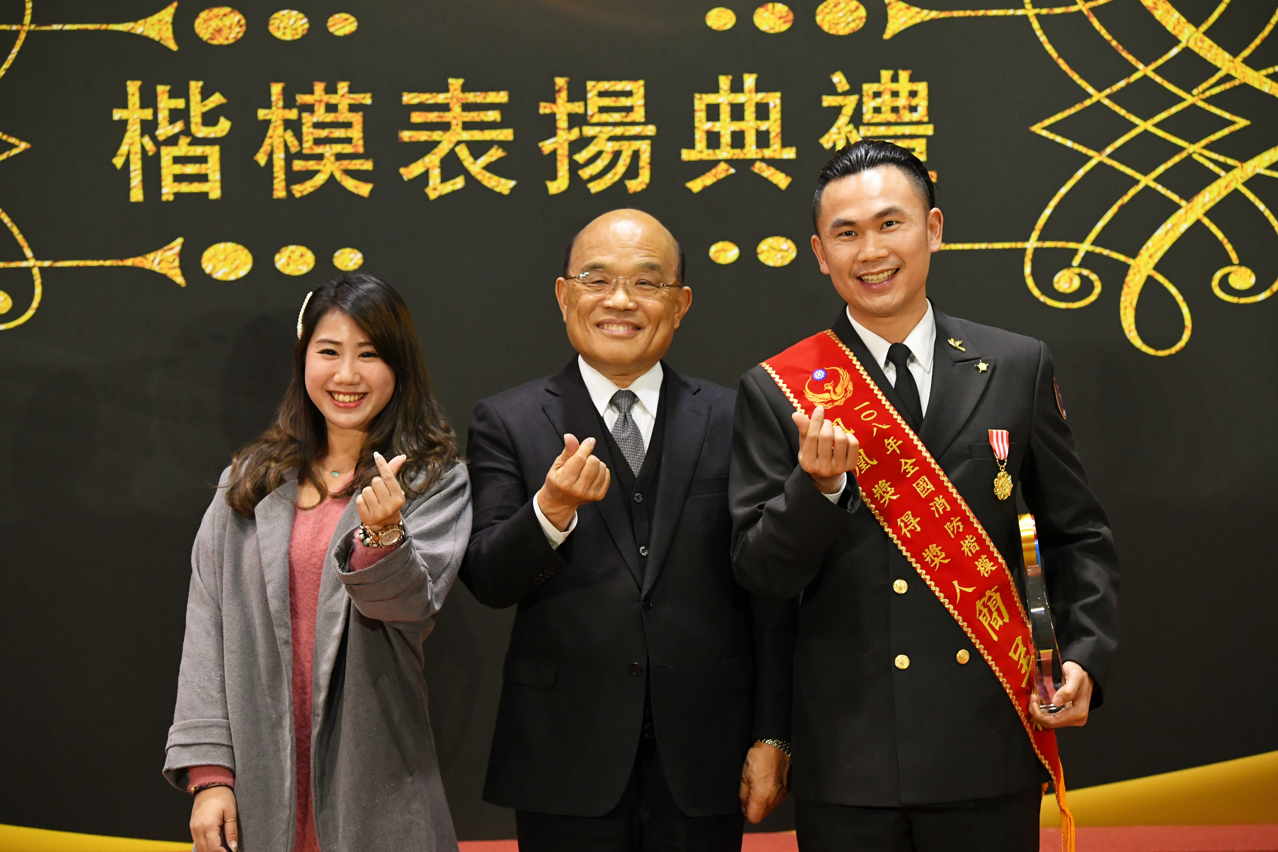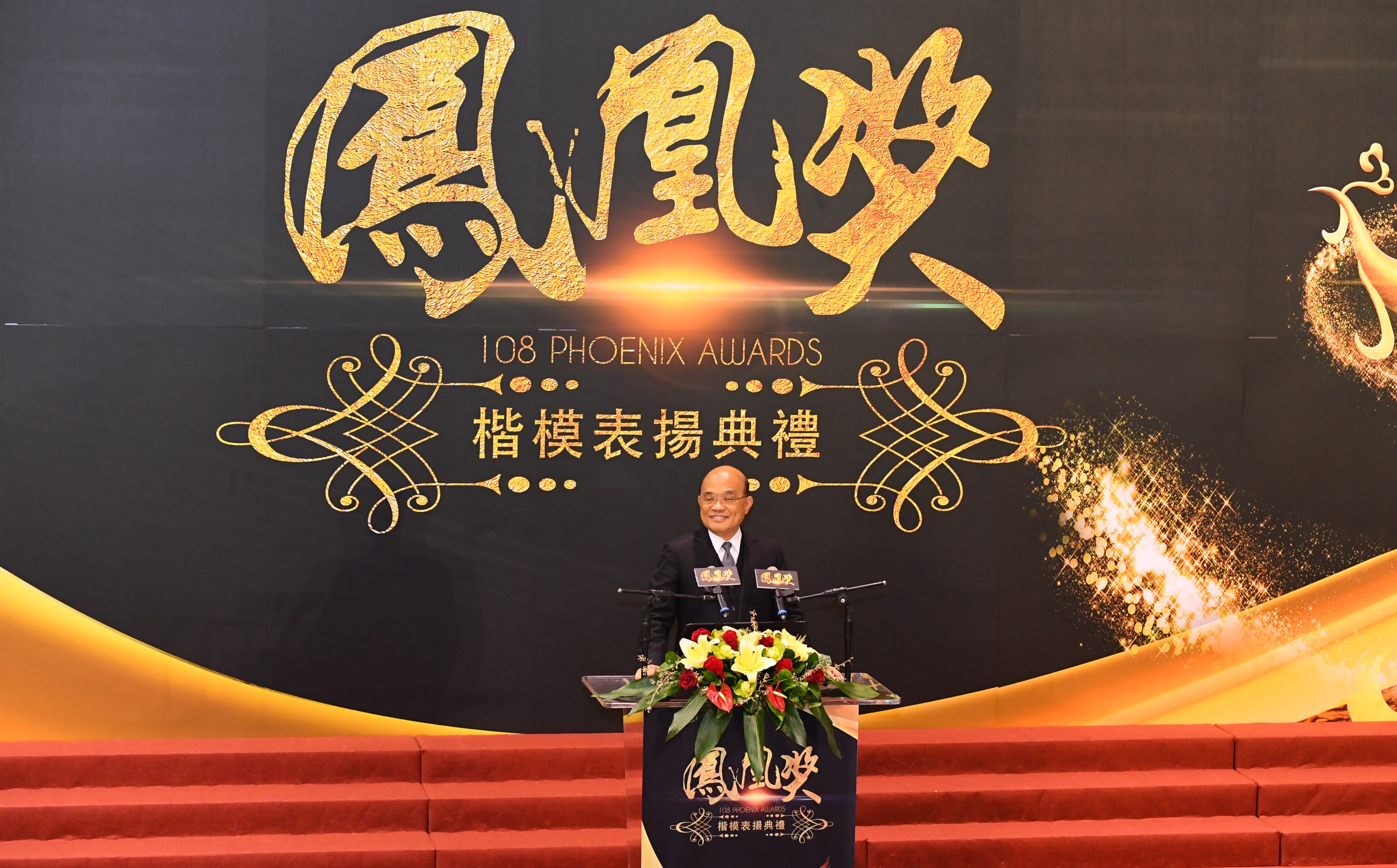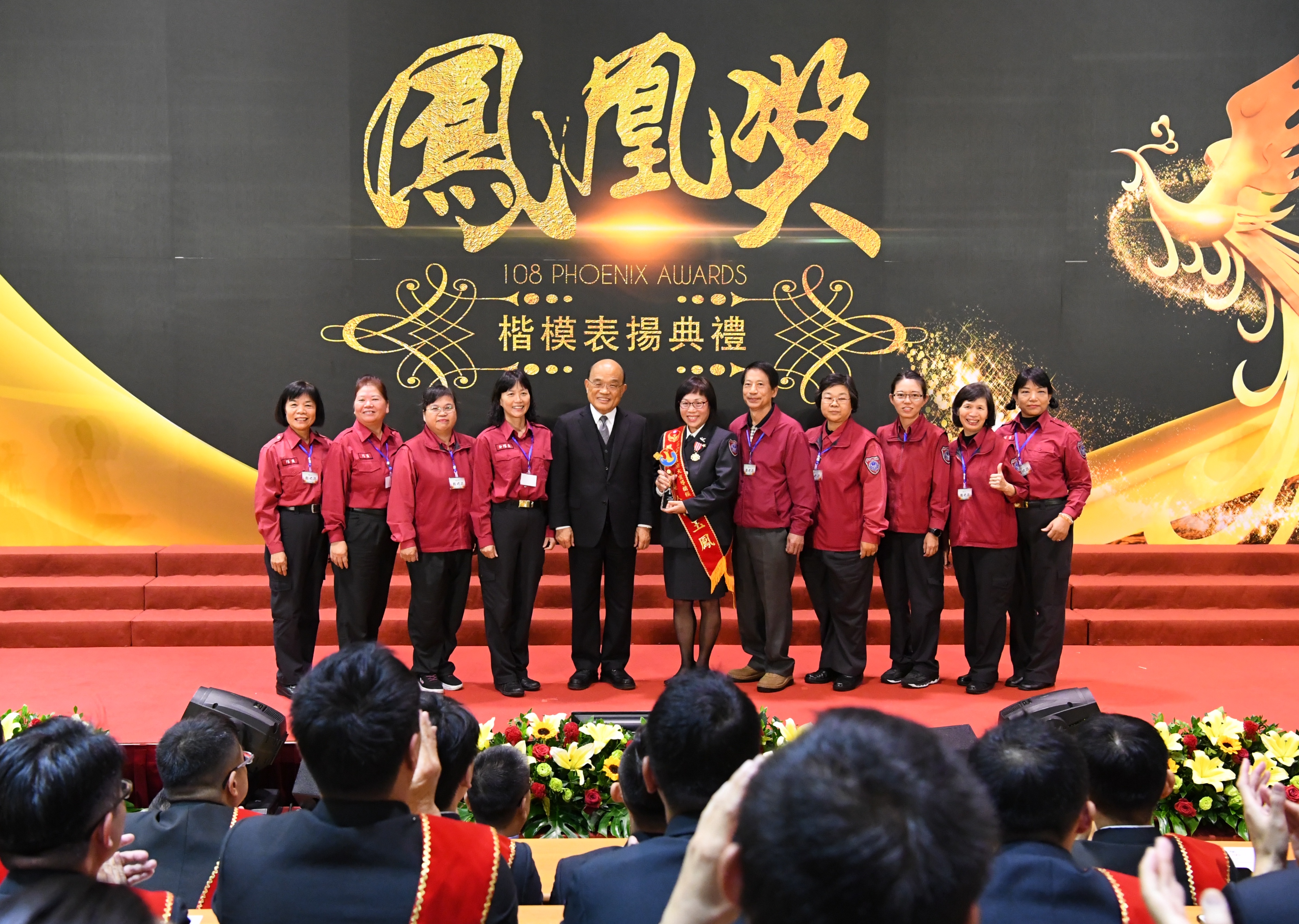 行政院長蘇貞昌今(15)日出席「108年鳳凰獎楷模表揚典禮」時表示,感謝消防人員的投入與努力,讓社會災害減至最小、國家國力得以保存,並表達國人同胞對消防人員的敬意與謝意。蘇院長除了逐一頒發獎章獎座,並與各楷模及其親友合影留念。