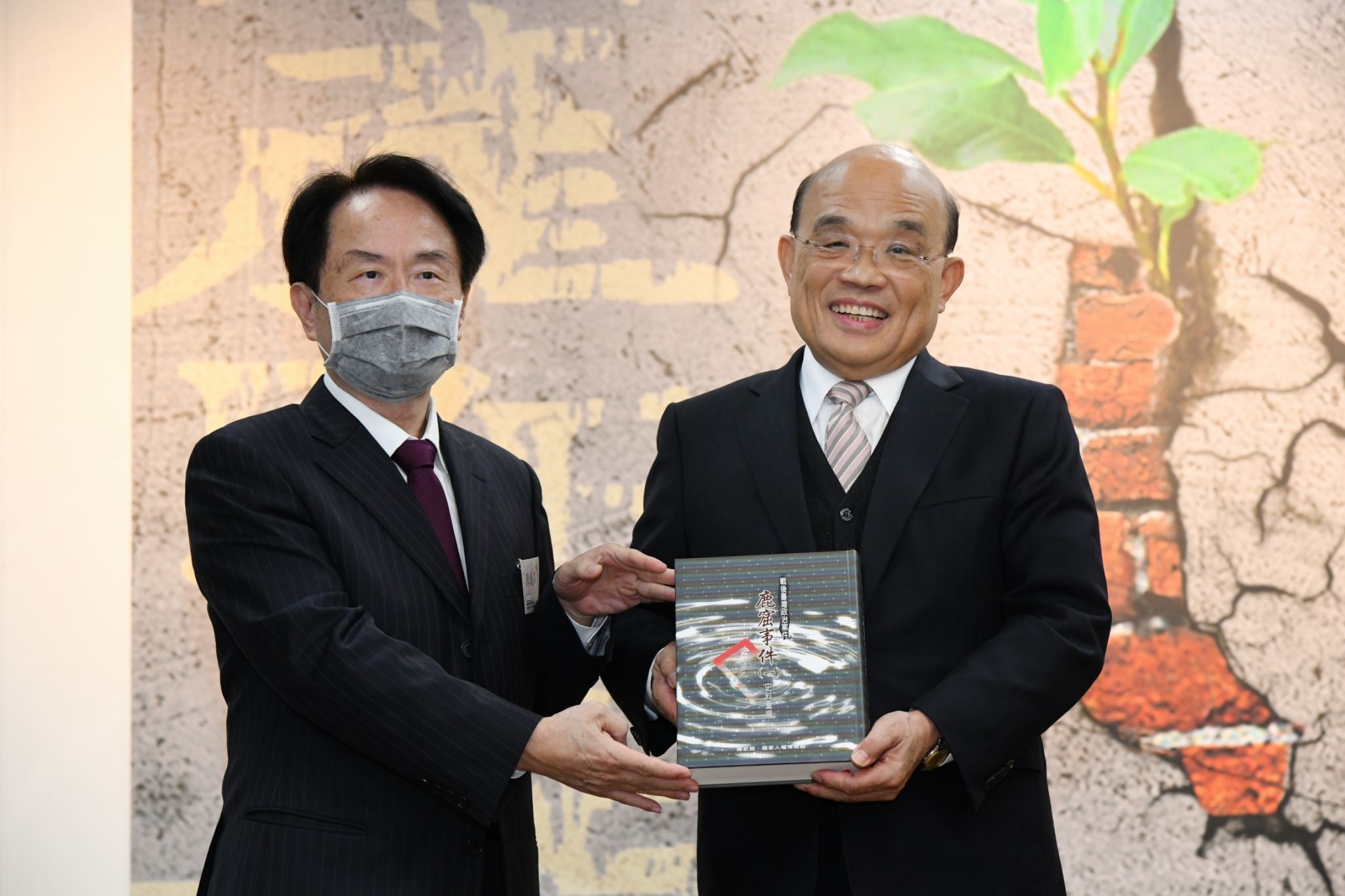 此行,蘇院長向姚嘉文等貴賓握手致意,並獲國史館陳館長所致贈的「戰後臺灣政治案件-鹿窟事件史料彙編」、「戰後臺灣政治案件-統中會案史料彙編」等書。