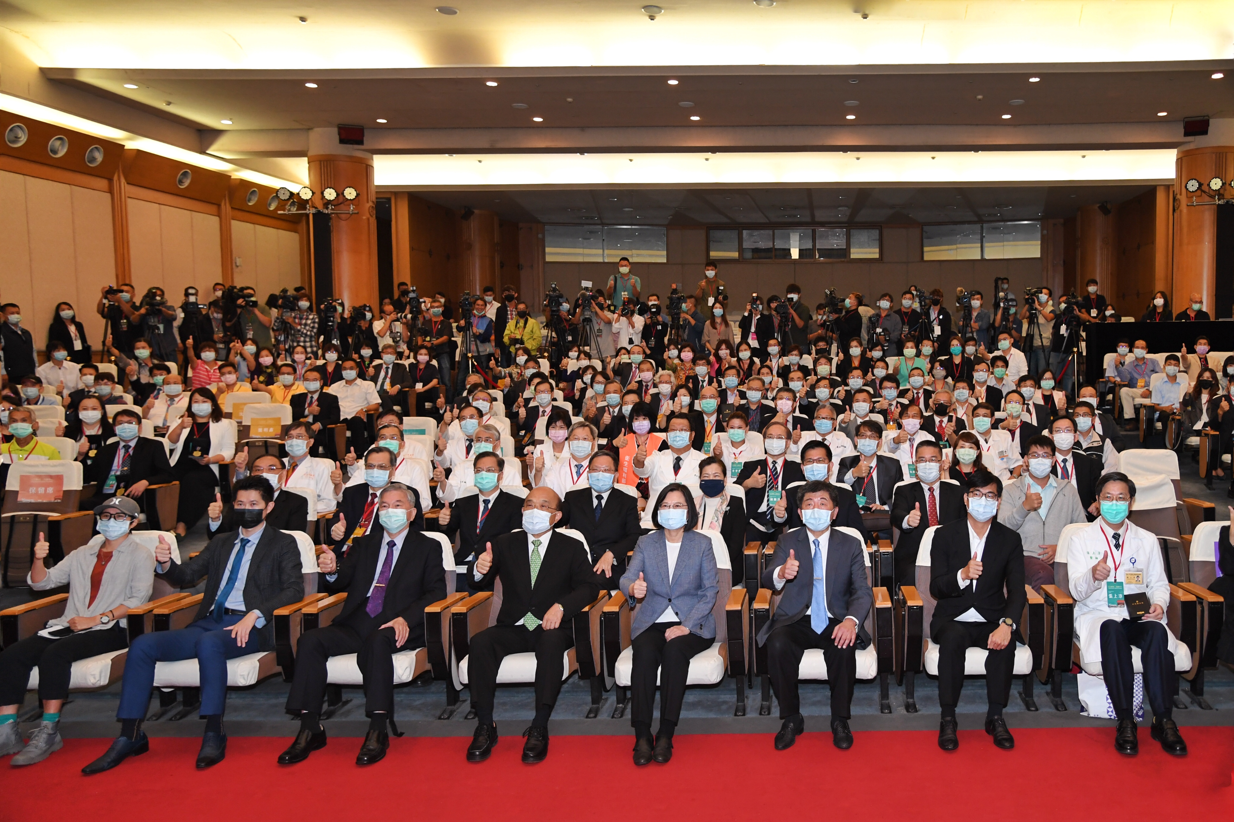 隨後,蔡總統頒發印有致謝詞及總統與蘇院長共同署名的「防疫獎章」予全國44位防疫有功個人及團體代表,並與蘇院長、衛福部長陳時中及受獎人合影留念,感謝受獎人在防疫期間不辭辛勞,為國人全心全力投入防疫的無私貢獻。