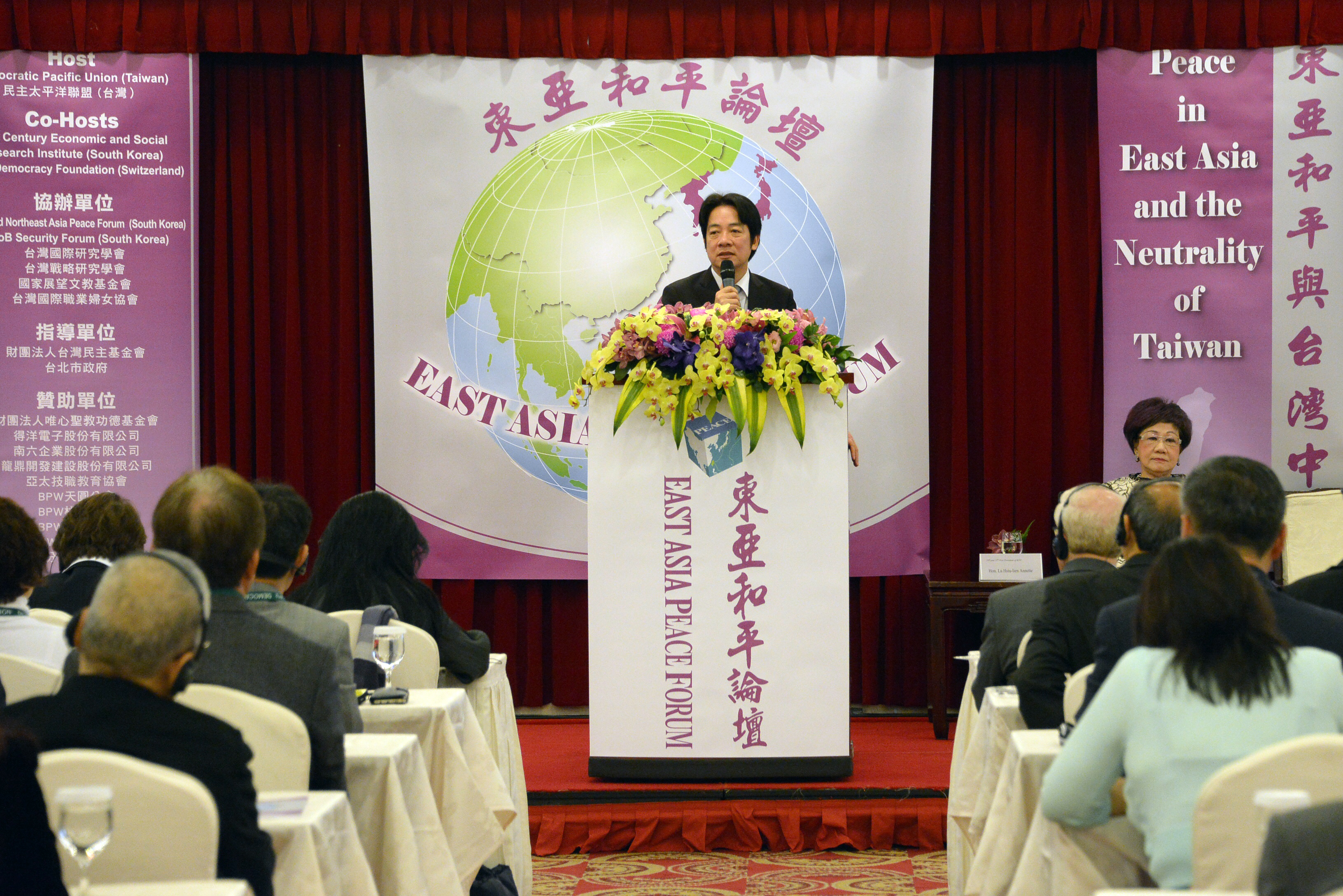 賴院長表示,就經濟角度上看,亞洲欣欣向榮;但就安全條件來說,亞洲可謂步步危機,因此呂秀蓮前副總統號召舉辦「東亞和平論壇」,期待經由各國共襄盛舉、集思廣益,提出有效方法,解決日益嚴重的亞洲危機,讓經濟持續發展、區域人民和平生存。