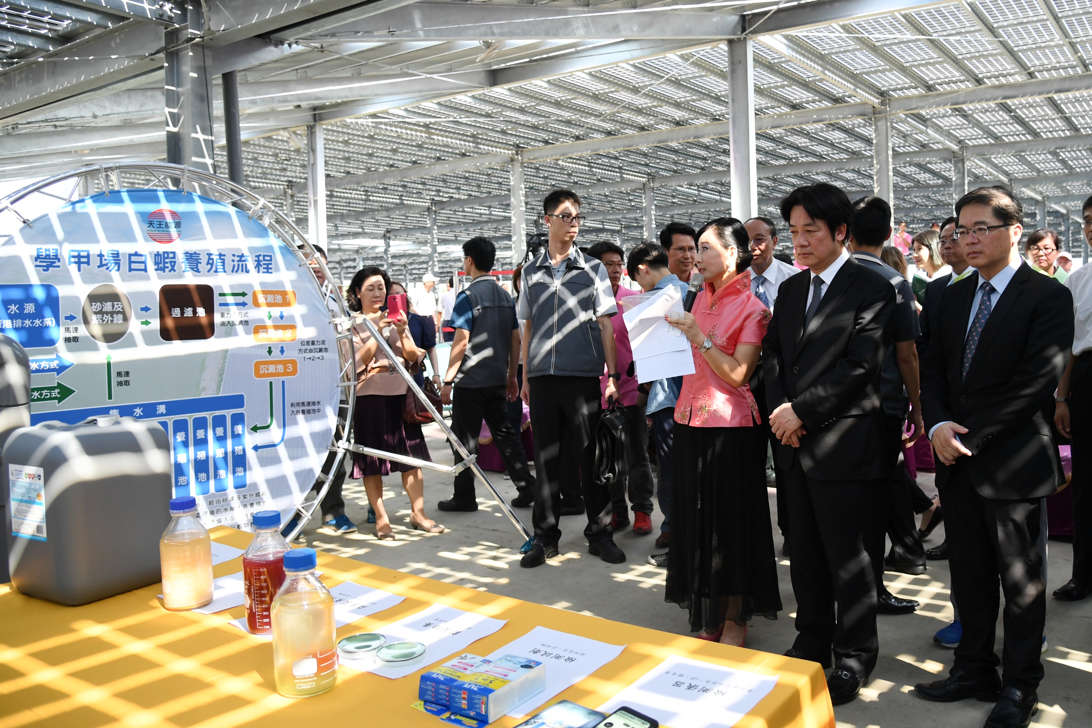 賴院長表示,天王能源王惠瑩董事長在推動此場區過程中克服種種困難,令人欽佩。未來請農委會、漁業署及地方政府等合作,中央與地方政府共同推廣農、漁及畜電共生。