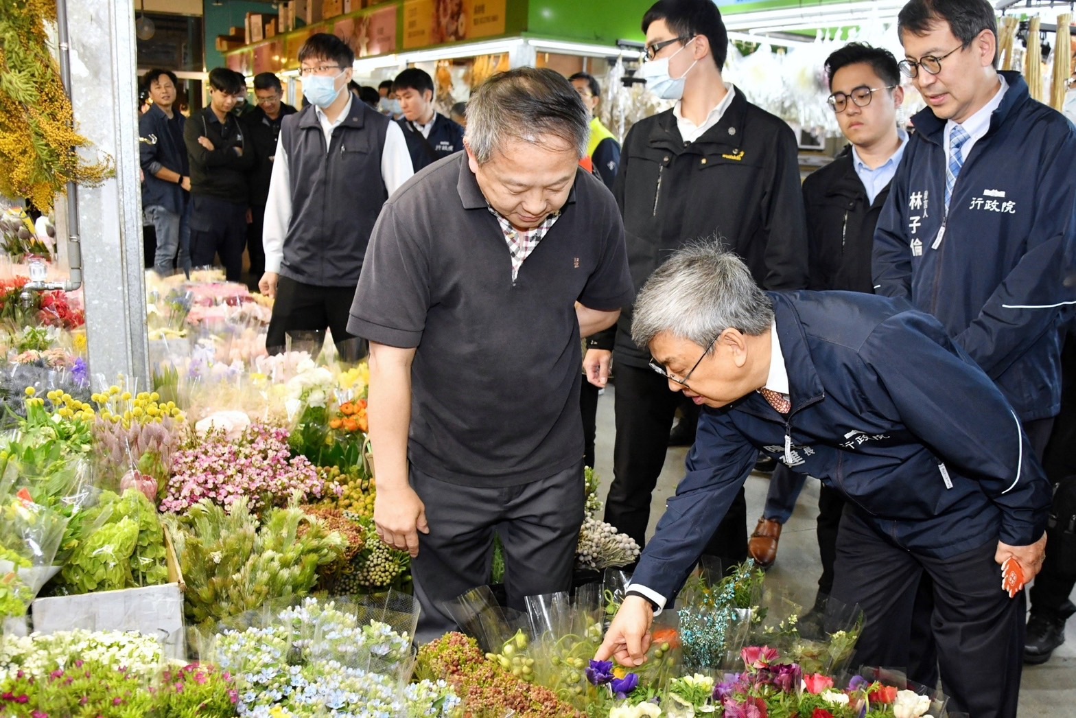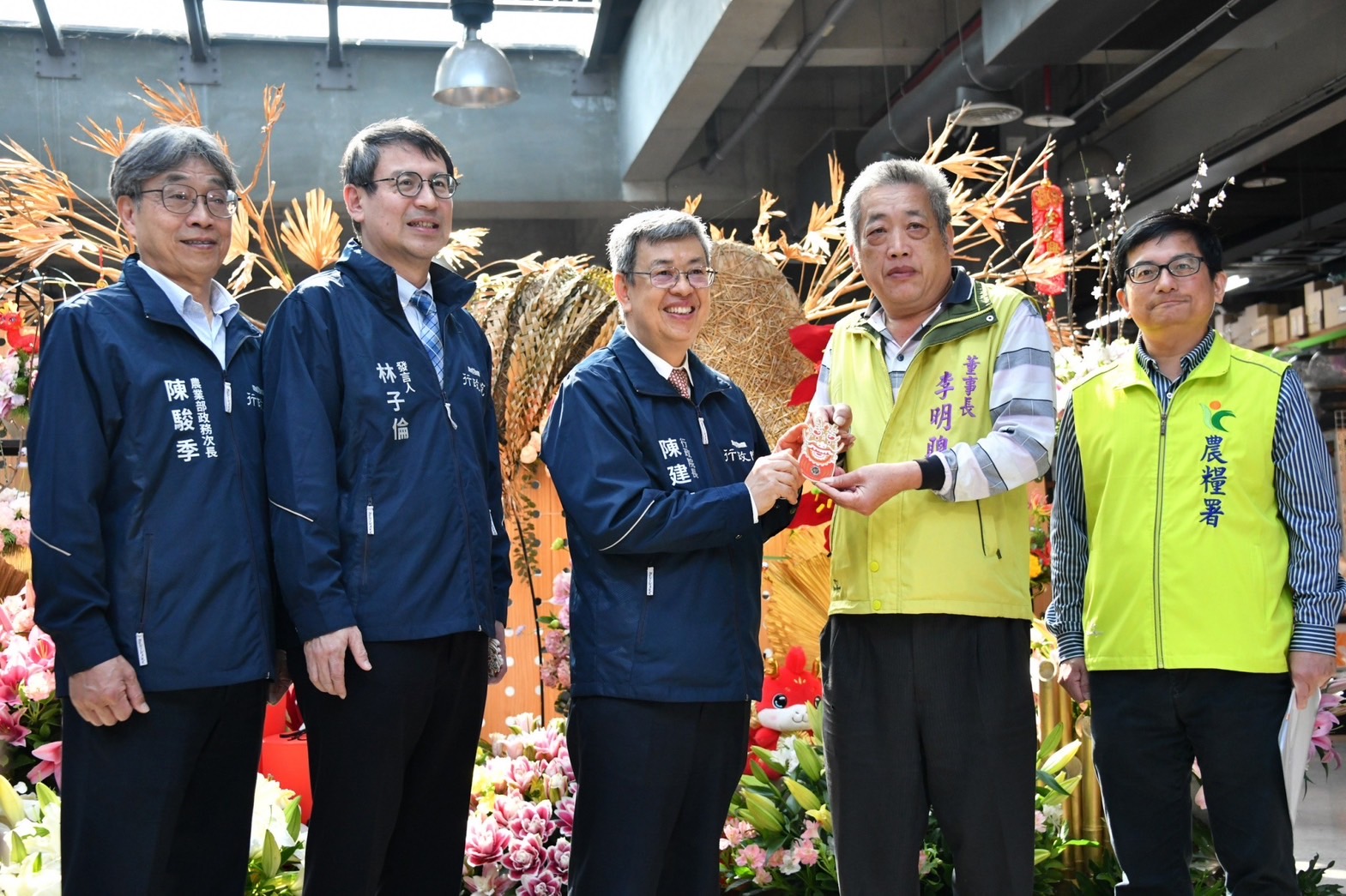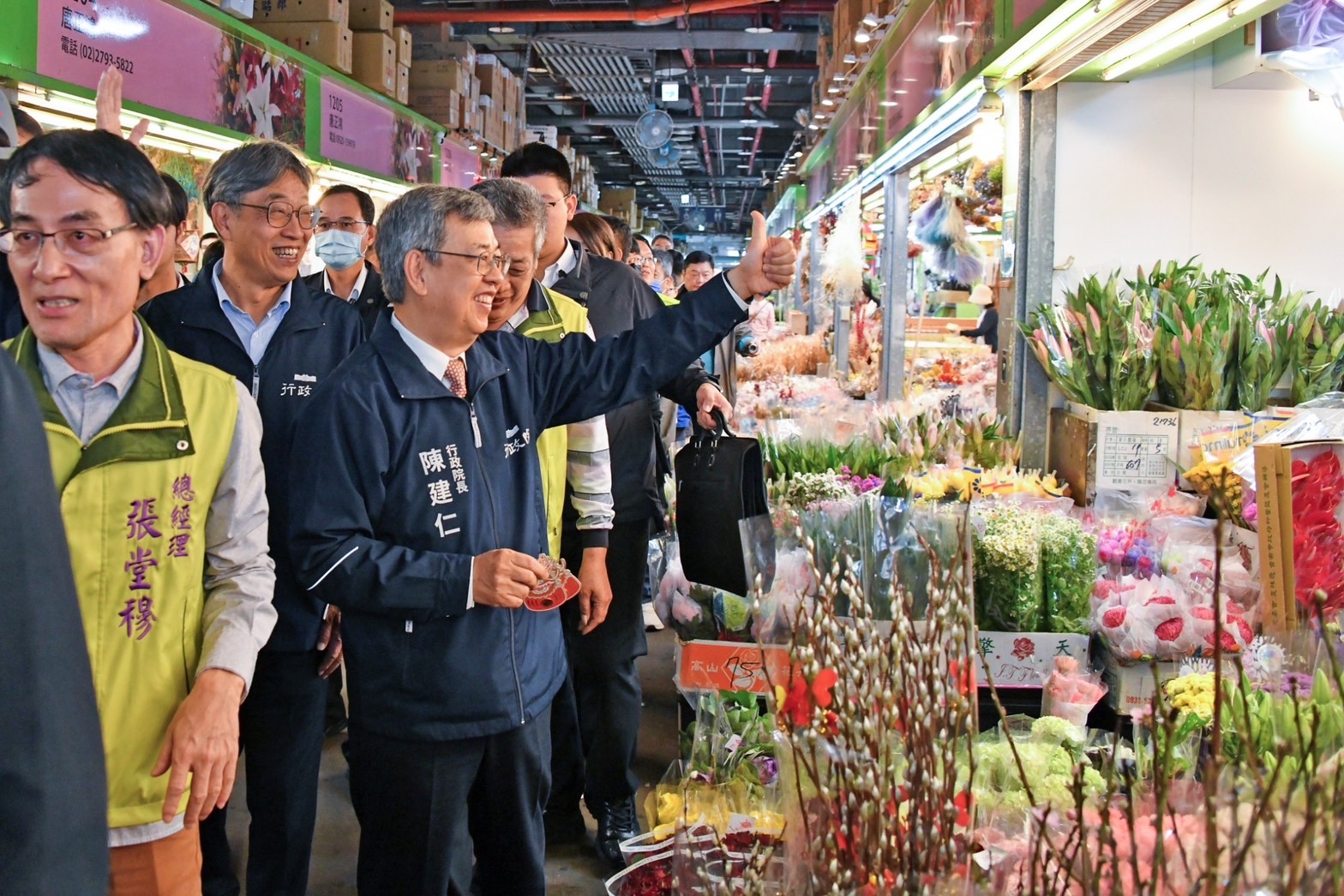 陳院長抵達後,在台北花卉產銷股份有限公司李明聰董事長及張堂穆總經理引導下,偕同行政院林子倫發言人、農業部陳駿季代理部長、農糧署蘇茂祥代理署長等人一同巡視批發市場攤商花卉販售供應情形,並沿途向攤商問好拜年,祝福他們生意興隆。致詞結束後,院長接受李明聰董事長贈送蝴蝶蘭盆栽一盆,並回贈賀歲福袋,祝賀新年快樂。