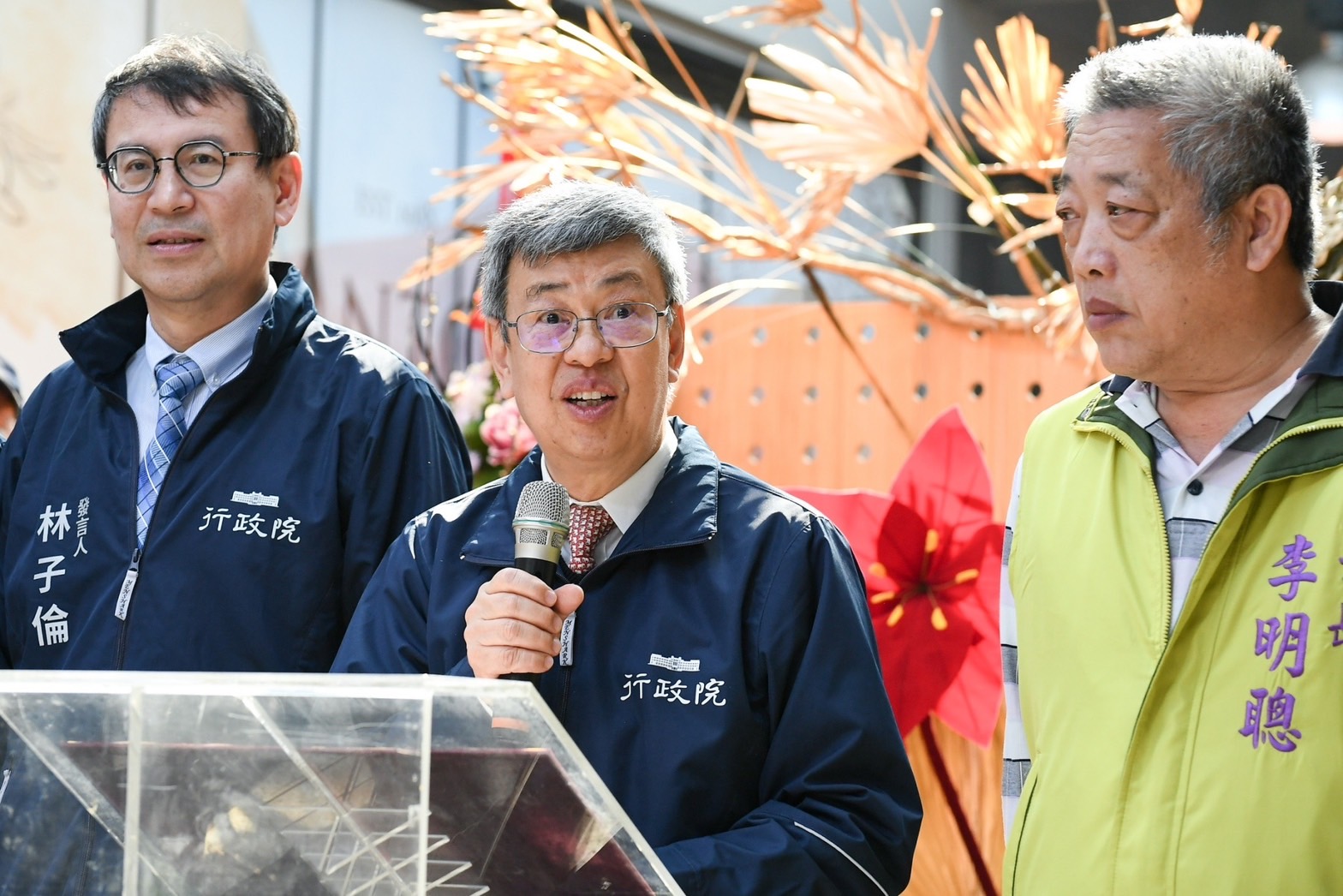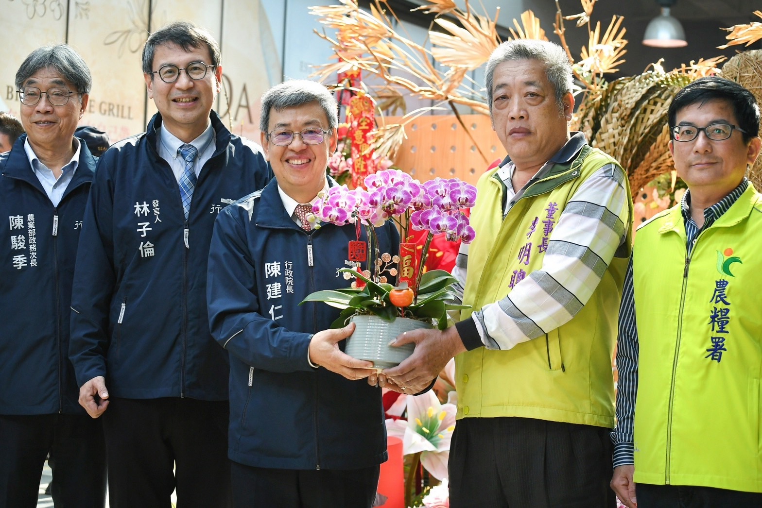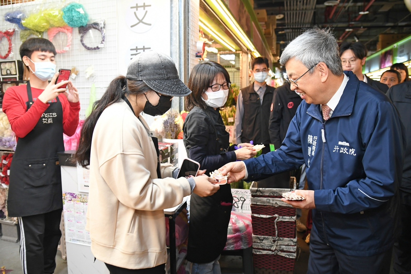 陳院長抵達後,在台北花卉產銷股份有限公司李明聰董事長及張堂穆總經理引導下,偕同行政院林子倫發言人、農業部陳駿季代理部長、農糧署蘇茂祥代理署長等人一同巡視批發市場攤商花卉販售供應情形,並沿途向攤商問好拜年,祝福他們生意興隆。致詞結束後,院長接受李明聰董事長贈送蝴蝶蘭盆栽一盆,並回贈賀歲福袋,祝賀新年快樂。
