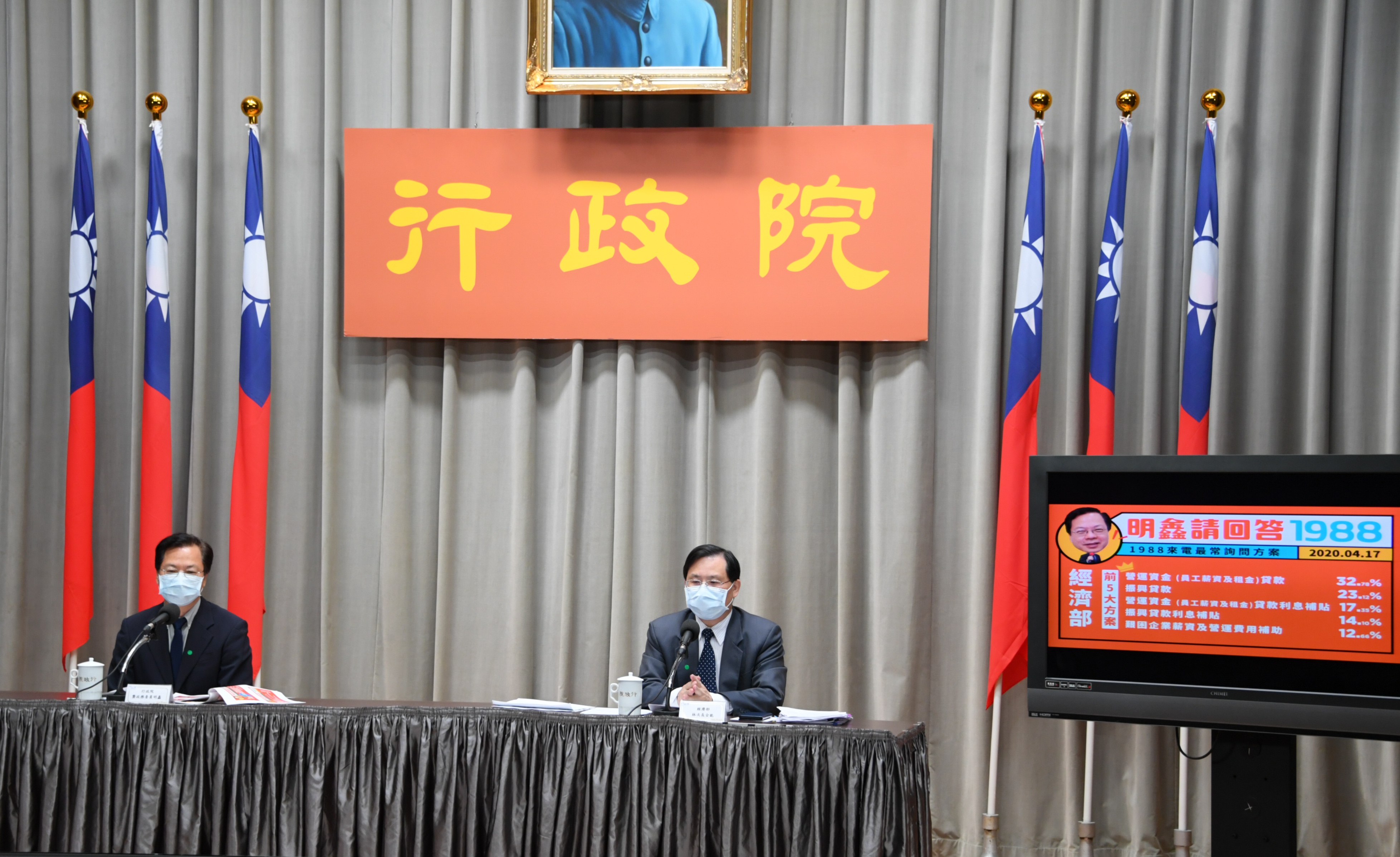 有關「1988」諮詢專線最常被詢問的問題,龔政委表示,前三名部會分別為經濟部57%、勞動部18%及交通部5%,詢問最多仍是經濟部的營運資金(員工薪資及租金)貸款方案;勞動部以自營作業者補貼方案詢問比例為高;交通部則是計程車、遊覽車駕駛補助詢問度較高。