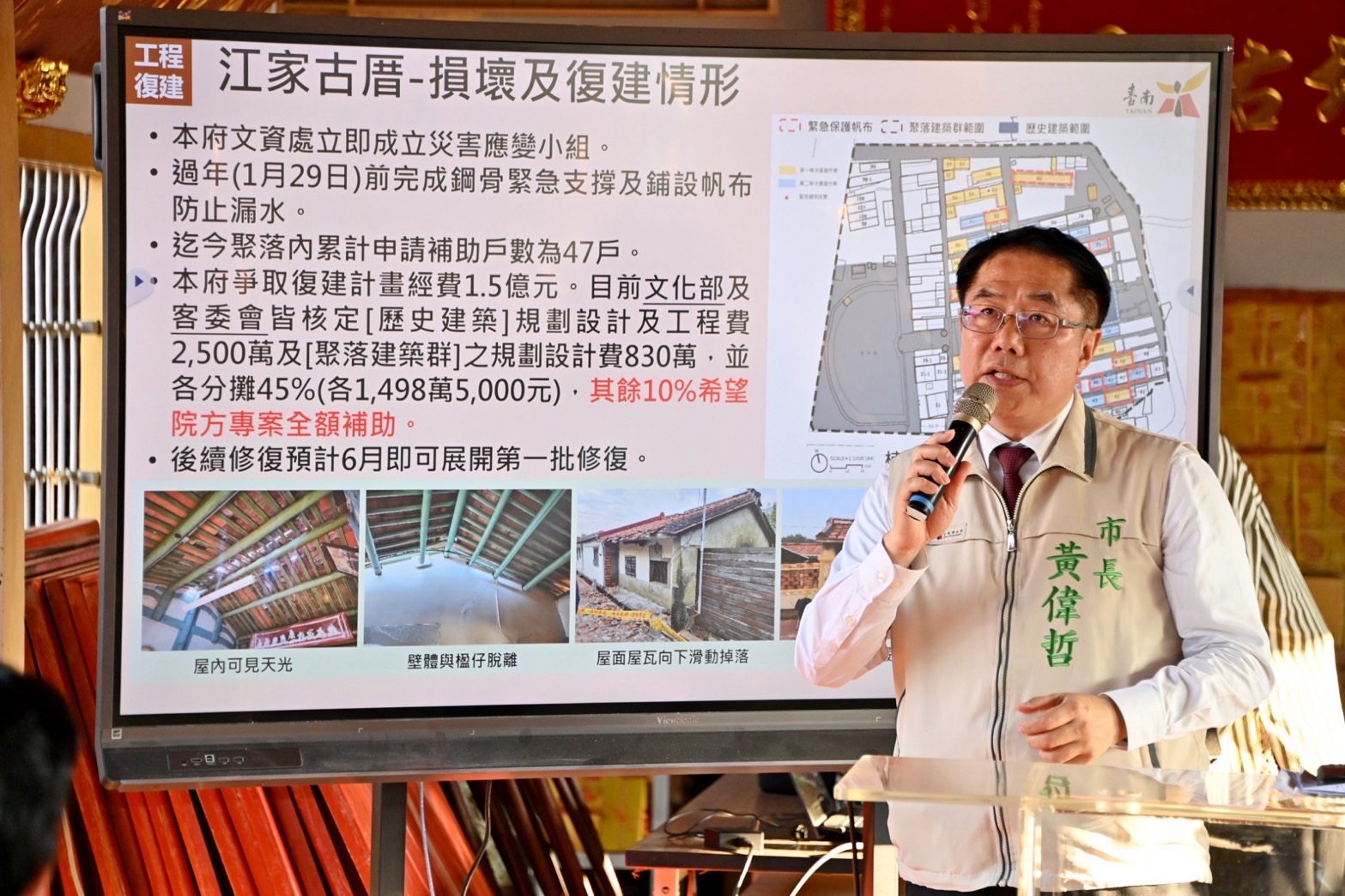 卓院長說,震災後,臺南市部分區域的建築物損害相當嚴重,包括楠西、玉井、南化、東山等區域的危險建築物多達2,059件,其中紅單500件、黃單1,559件,後續將依據結構技師鑑定評估,如實辦理受災民宅的重建、補強、修繕補助、安置租金補貼等。此外,針對今日視察地點-江家古厝之復建部分,陳金德政委已允諾中央負責,將由文化部及客家委員會全額分攤。