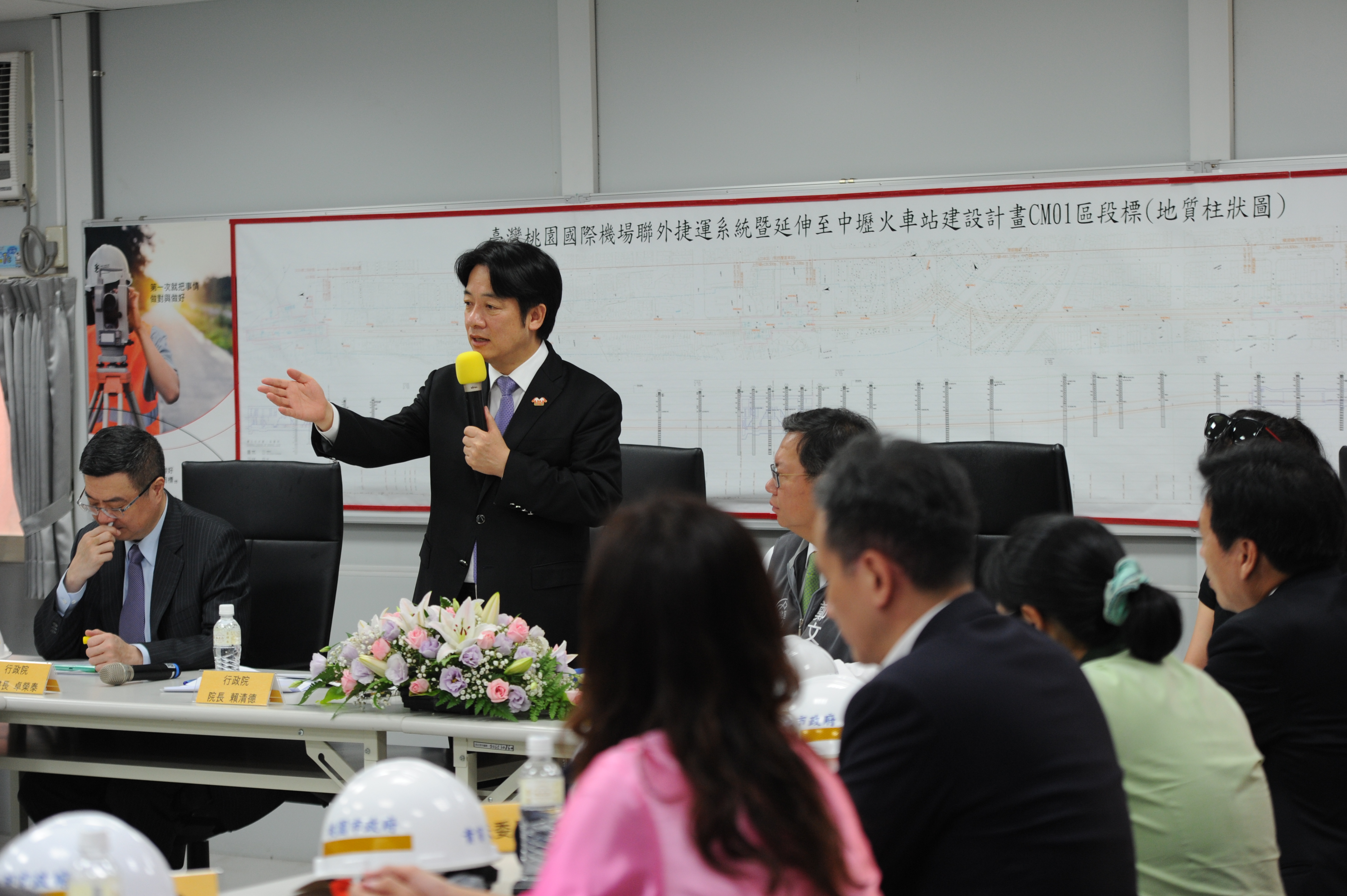 賴院長表示,機場捷運延伸至中壢經費需求138億元,鐵路地下化逾900億元,捷運綠線延伸到中壢亦需1,000餘億元經費,中央與地方將共同投入約2,345億元,協助桃園市完成相關交通建設,造福當地民眾。此外,賴院長提醒,天氣炎熱,請工程人員務必注意施工安全與身體健康,並注意周邊居民房屋安全,盼掌握施工期程,如期如質完工。