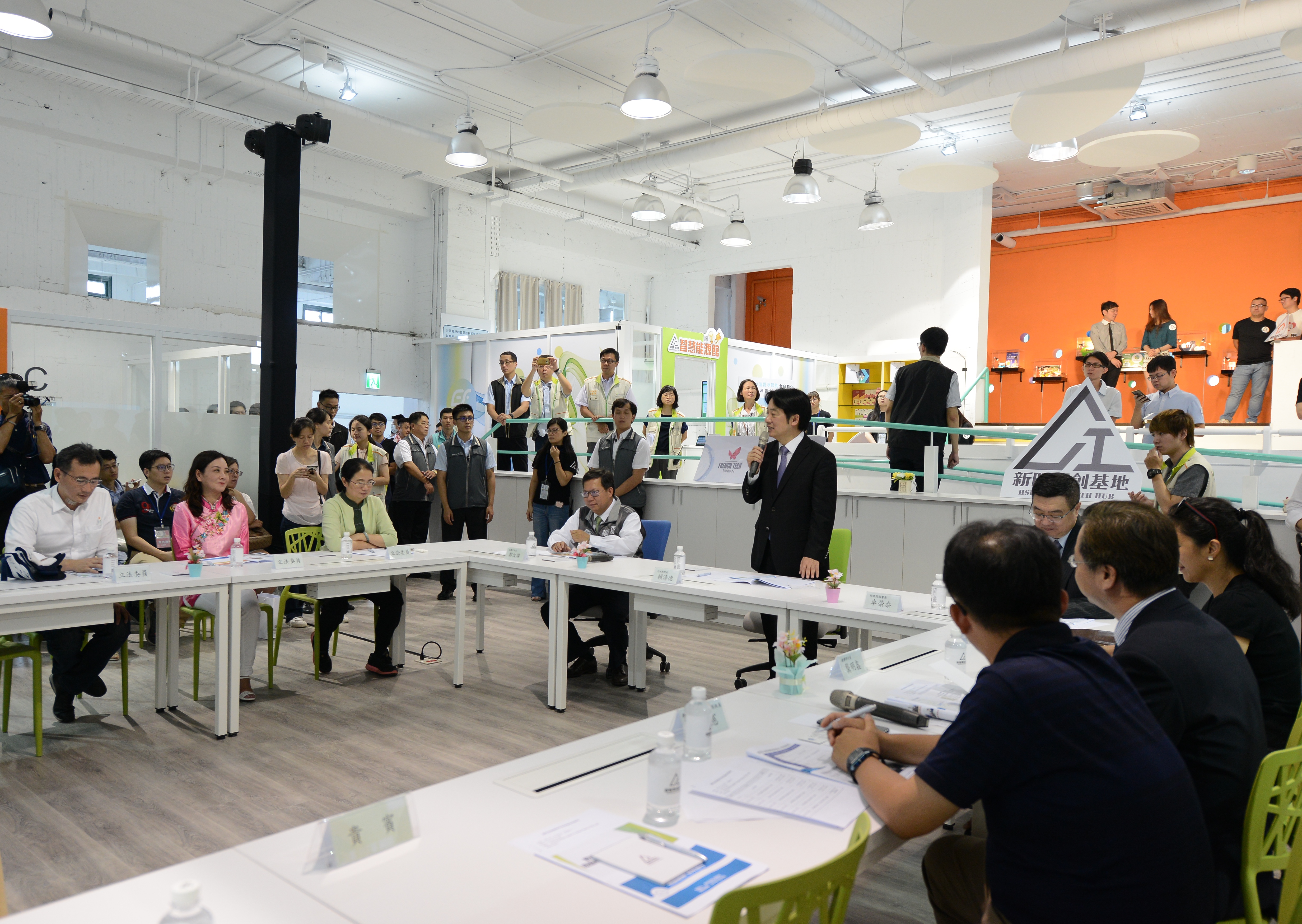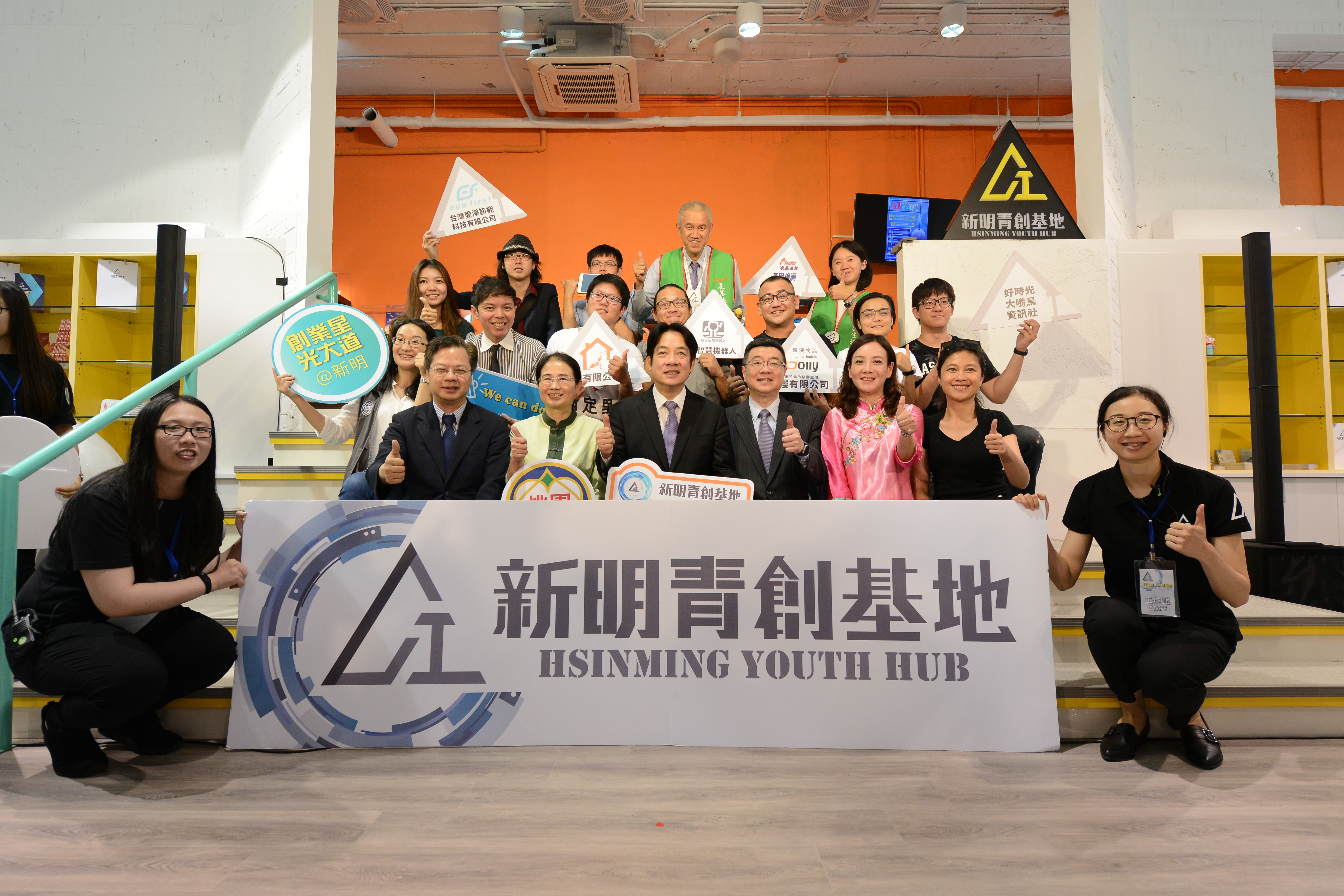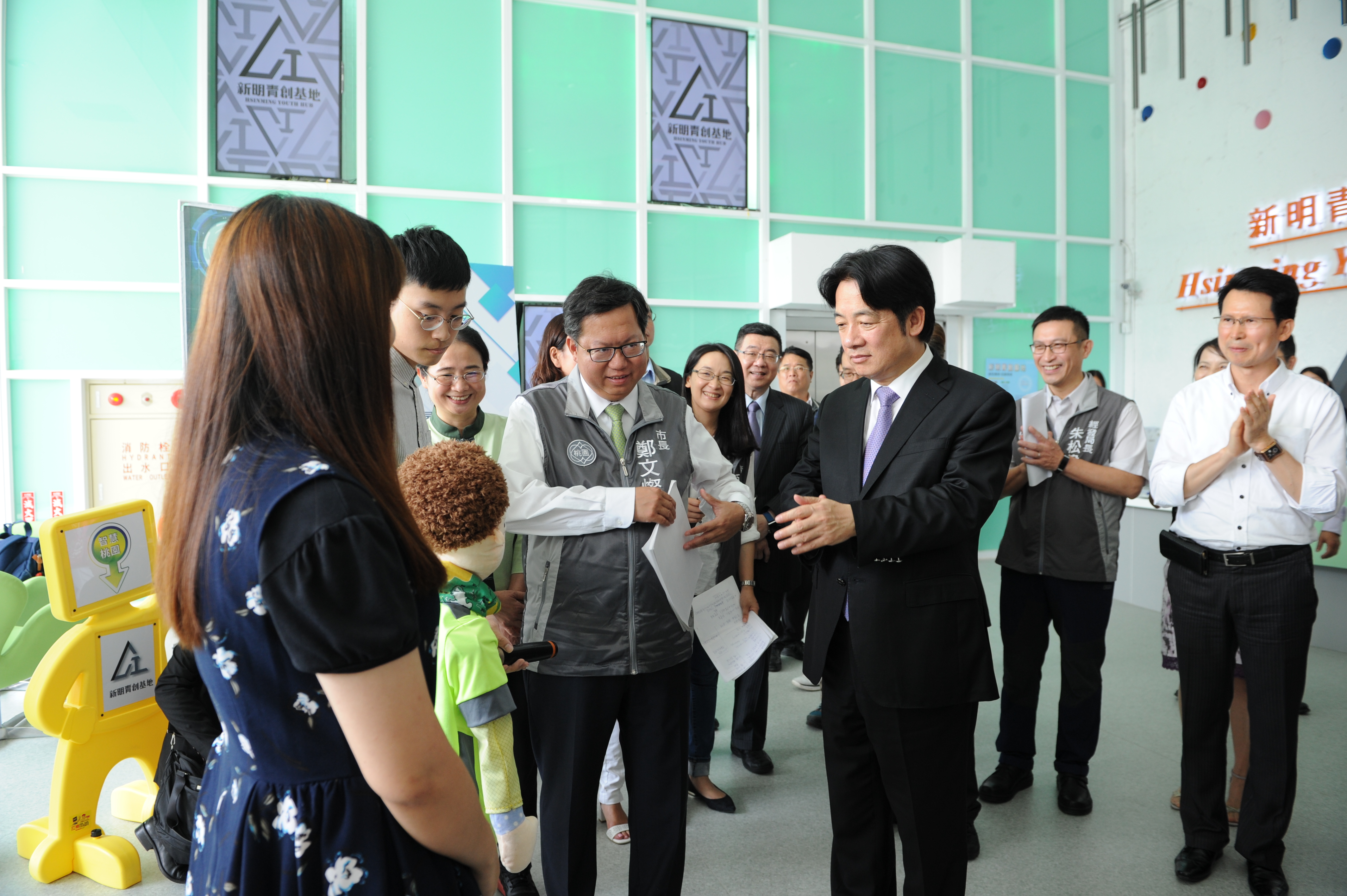 隨後,賴院長於參訪新明青創基地時表示,桃園市是台灣最年輕的城市,出生率與人口成長率皆為全國第一,市政府成立青年事務局,照顧年輕人,協助年輕人圓夢。
