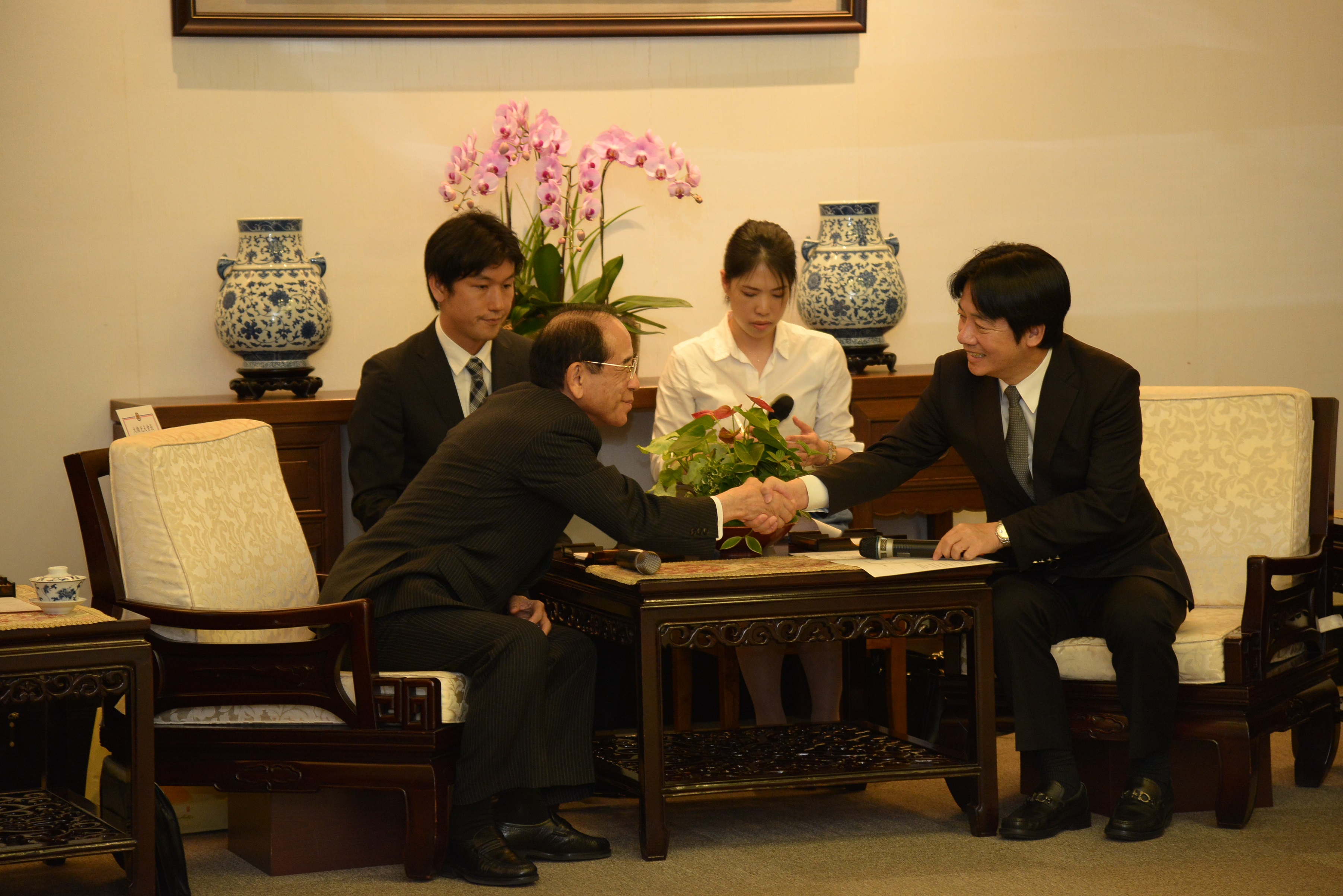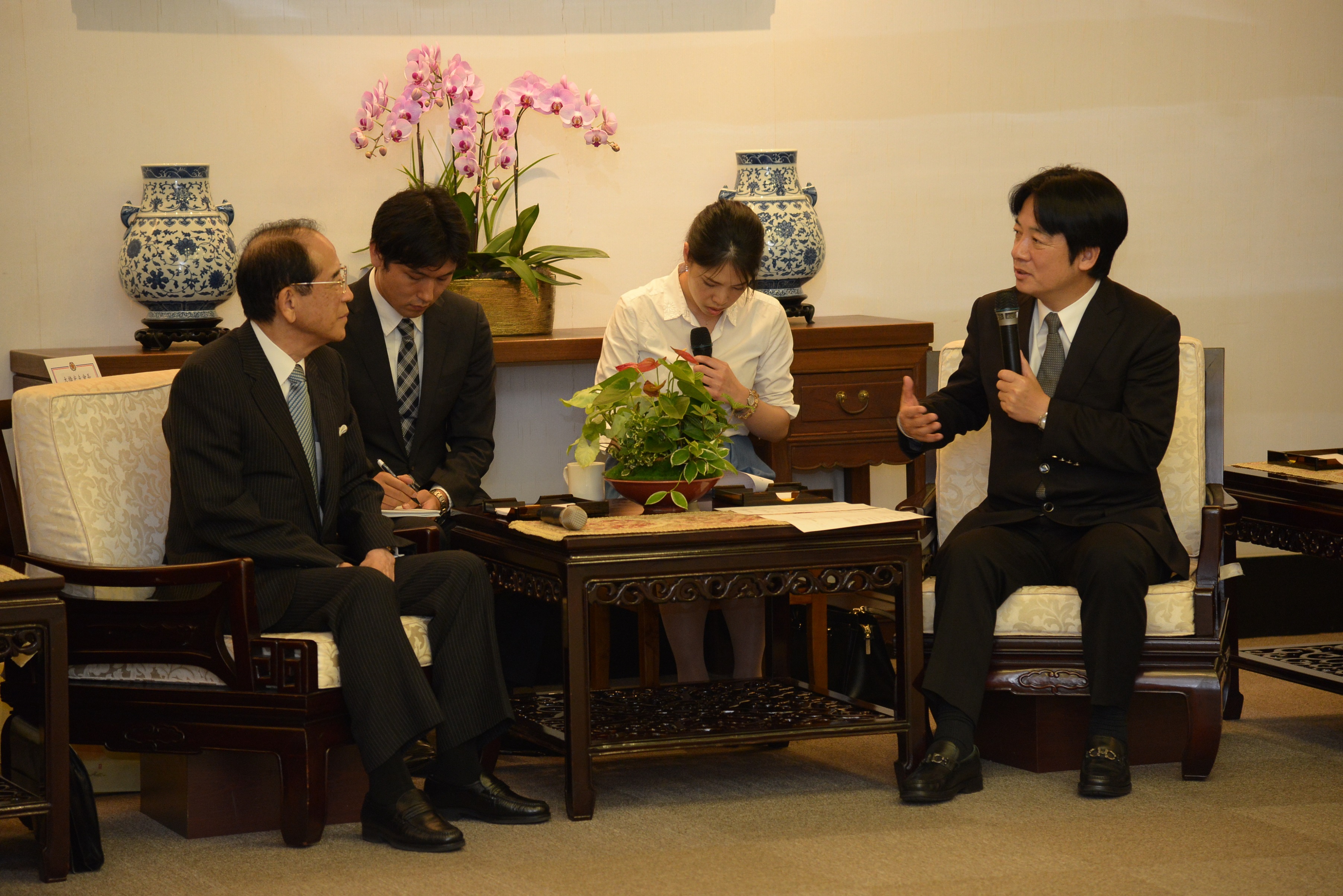行政院長賴清德今(27)日接見「日本台灣交流協會」大橋光夫會長等一行時表示,他過去擔任台南市長,知道台南這個城市和日本的淵源很深,雙方密切合作;來到行政院後,更進一步發現台灣和日本在經濟、貿易、文化、教育等各方面交流也非常密切。日本也仗義執言,在國際上幫助台灣,國人都非常感謝。