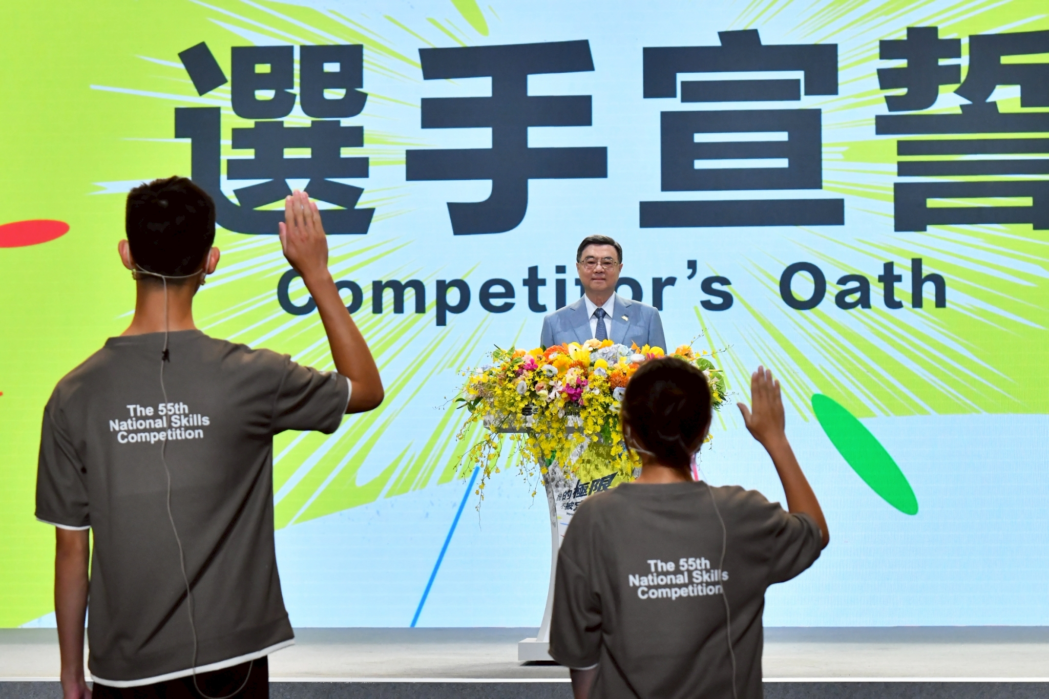 致詞結束後,由劉宇恩選手及茒智苓選手代表進行宣誓,卓院長於舞臺上監誓;隨後,卓院長與行政院龔明鑫秘書長、李慧芝發言人、勞動部洪申翰部長、經濟部何晉滄次長、教育部技術及職業教育司楊玉惠司長、侯世光總裁判長、劉宇恩選手及茒智苓選手等人,一同觸碰LED螢幕按鈕,完成啟動儀式,並與全國技能競賽吉祥物光比、鹿比合影留念。
