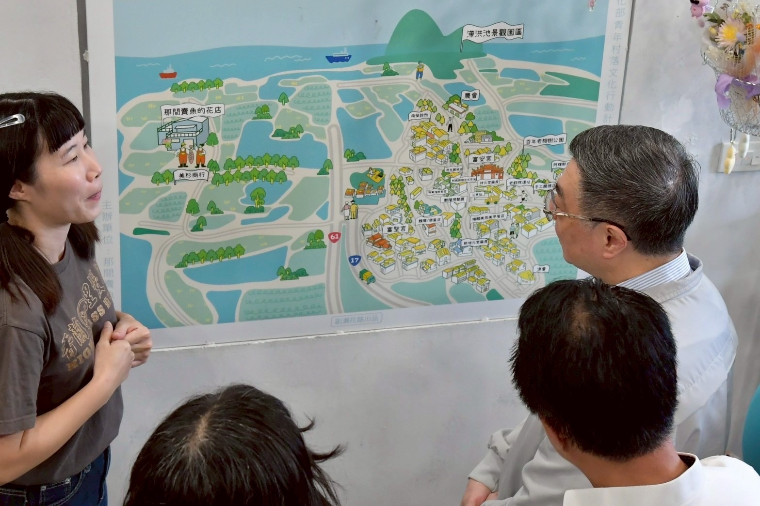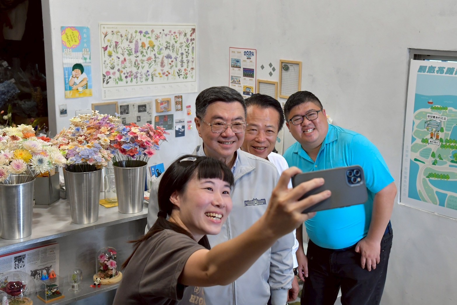 隨後,卓院長前往參訪「那間賣魚的花店」,了解文化部在嘉義縣東石鄉推動「青年村落文化行動計畫」情形。卓院長先聽取花店創辦人蔡伊倫介紹「副瀨花路」地圖指南、店內空間規劃與陳列商品,並與行政院李慧芝發言人、雲嘉南區聯合服務中心劉米山執行長、李碧菁副執行長、文化部徐宜君次長、蔡易餘立法委員、嘉義縣翁章梁縣長等人,一邊品嚐花店未來規劃販售的飲品糕點,一邊傾聽蔡創辦人分享青年回鄉創業心路歷程、花藝創作,以及如何與社區連結;最後,一行人於花店門前合影留念。