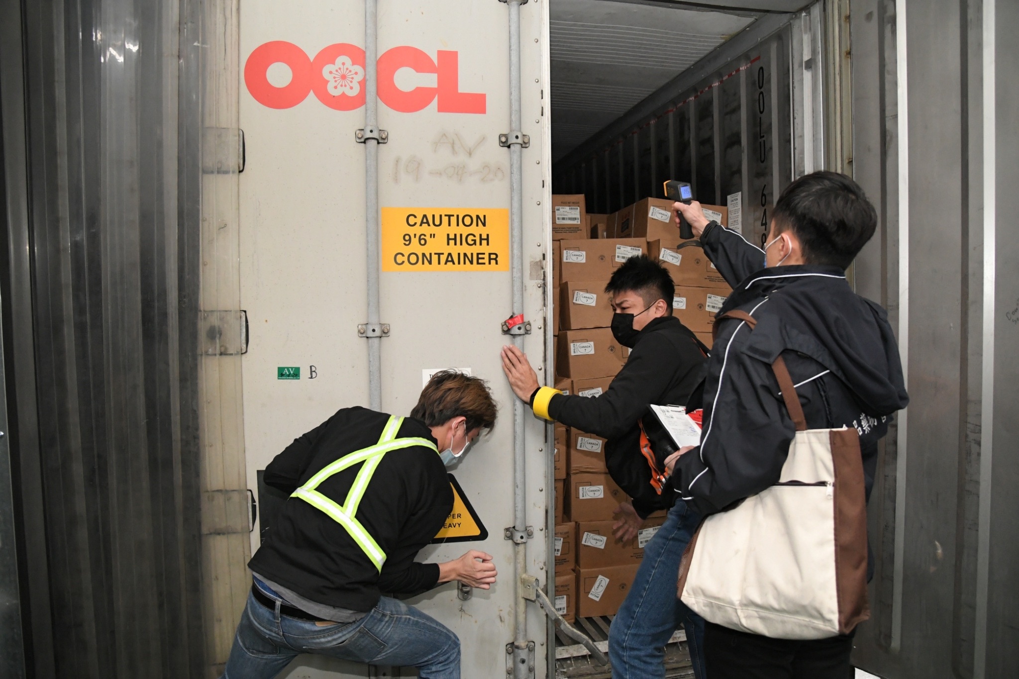 稍後,蘇院長視察進口豬肉剪封開櫃、貨品查驗確認、取樣及送樣檢驗等作業,期勉同仁一起努力,守護國人食品安全。
