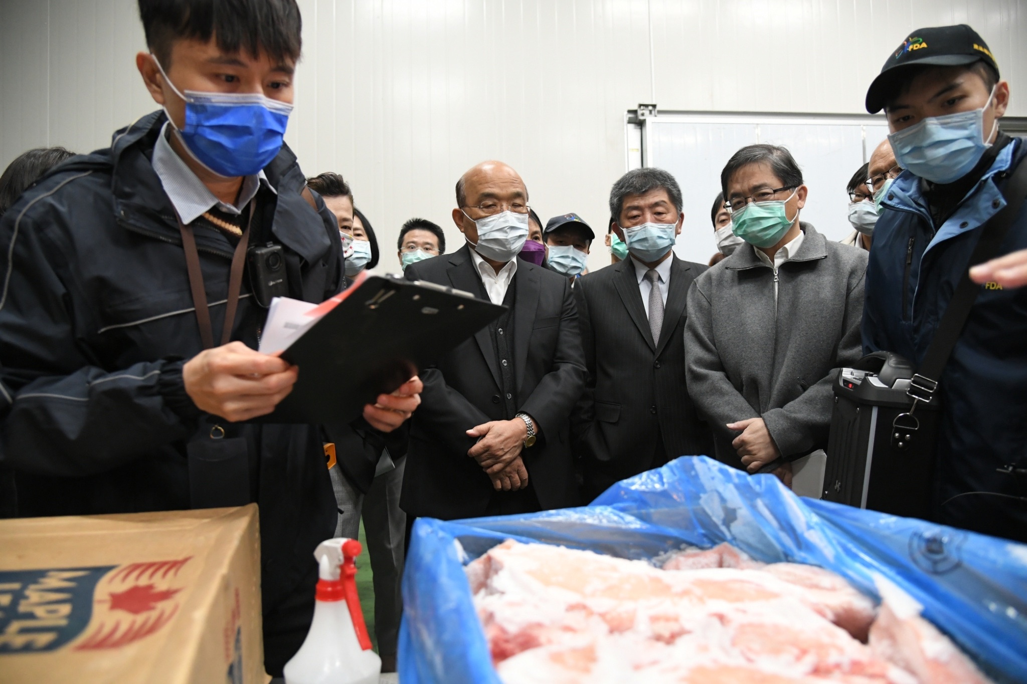 蘇院長也以非洲豬瘟為例,前(108)年1月14日,他上任行政院長第一天,即視察桃園機場的海關,他當場下令手提行李百分之百查驗。一直到今天,因為大家一起努力,守住非洲豬瘟,沒有讓它進來。同樣道理,政府用「豬肉儀表板」向國人同胞報告逐批檢驗的結果;絕對如同守住非洲豬瘟一樣,百分之百認真負責,從海關、到廚房、到餐桌,所有資訊全部公開透明。
