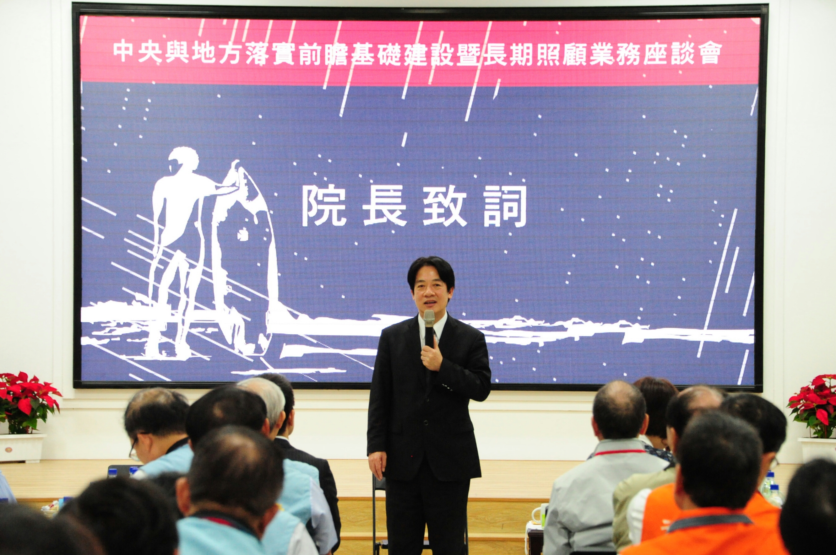 行政院長賴清德今(24)日至台東縣政府出席「中央與地方落實前瞻基礎建設暨長期照顧業務座談會」時表示,今日座談會性質屬行政院和台東縣政府的工作會議,希望縮短中央與地方政府距離,加強互動聯繫,以提升行政效率,共同解決問題。此外,蔡英文總統特別關心「前瞻基礎建設」及「長照2.0」計畫,不僅要建置下一世代所需的基礎建設,也可解決地方發展的困難。此行亦希望藉由中央與地方的互動合作,落實重大政策並順利推動。