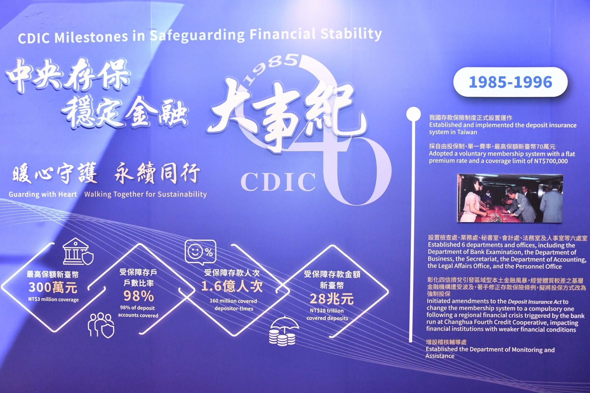 卓院長表示,健全金融制度、保障經濟安全及深化社會責任是政府應肩負的重要工作之一,因此導入更多保險機制,等同多加一層安全閥,讓國人能夠放心。而經過相關制度多年運行後,早年信用合作社發生擠兌,或問題金融機構退場等事件,現在不僅未再發生,相關單位亦可提前運用相關機制予以優化、強化及改善,維護整體金融市場健全。