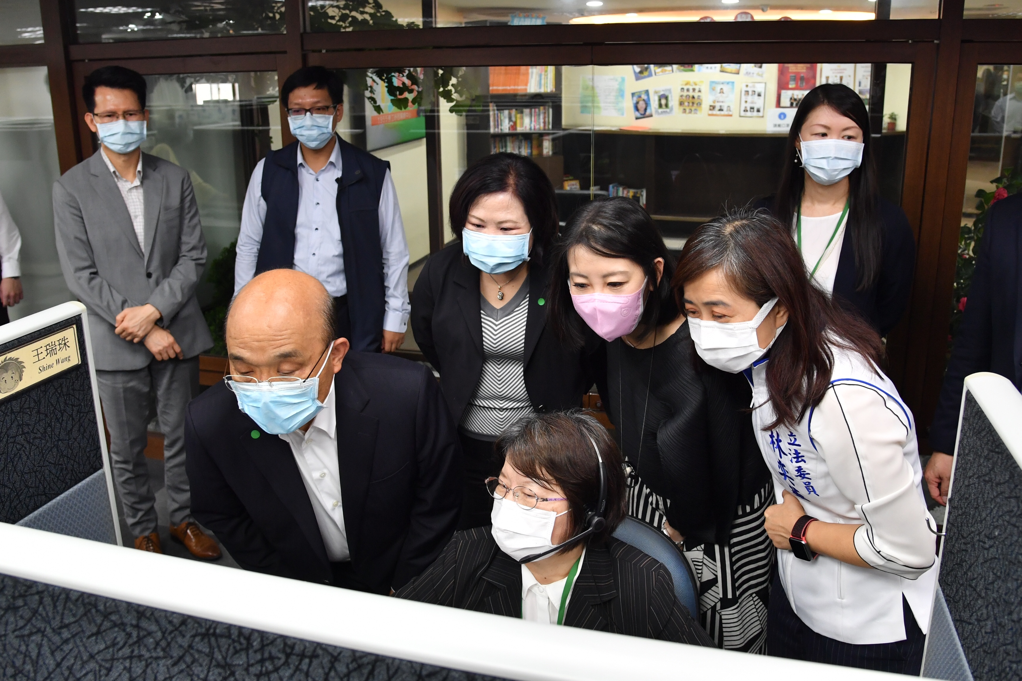 稍後,院長到1988及1955客服中心了解工作環境與線上接聽情形,也瞭解為視障服務人員特別設置的螢幕與設備。院長替每一位客服人員加油打氣,感謝他們不分假日替政府在第一線,為民眾說明各項紓困方案內容,解決問題。