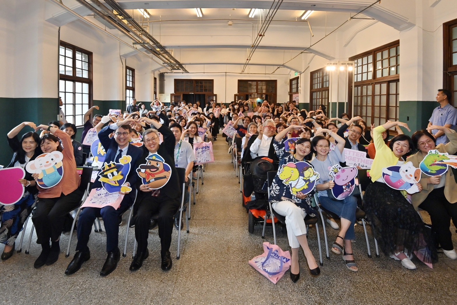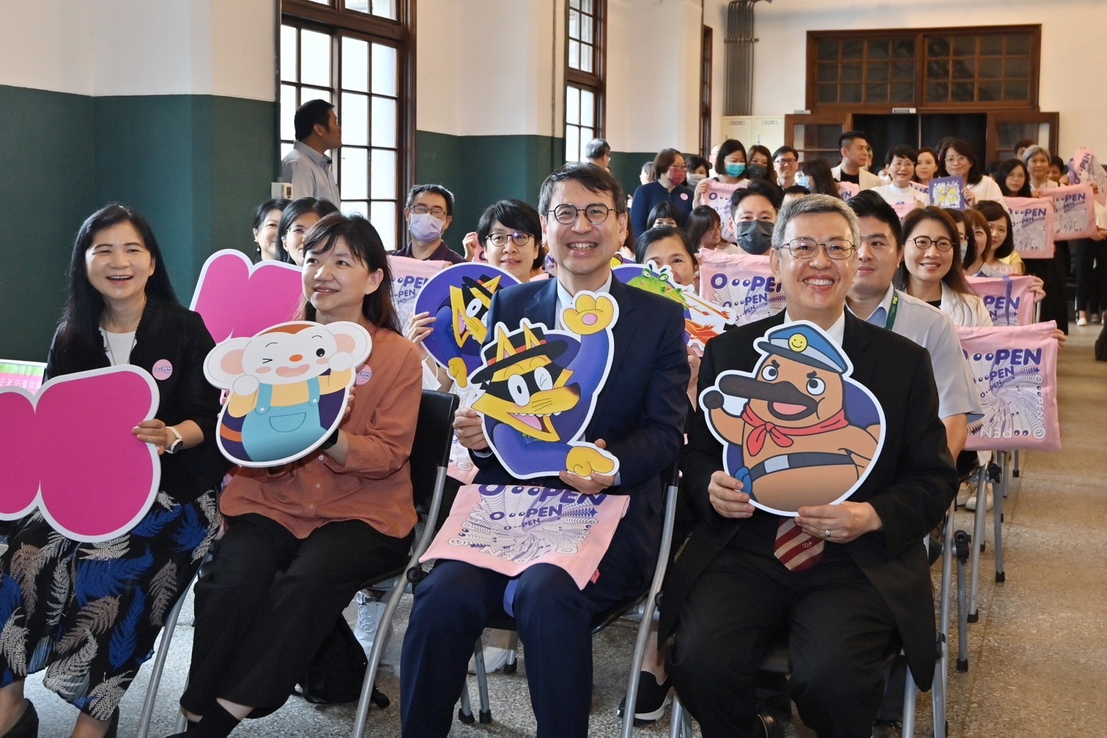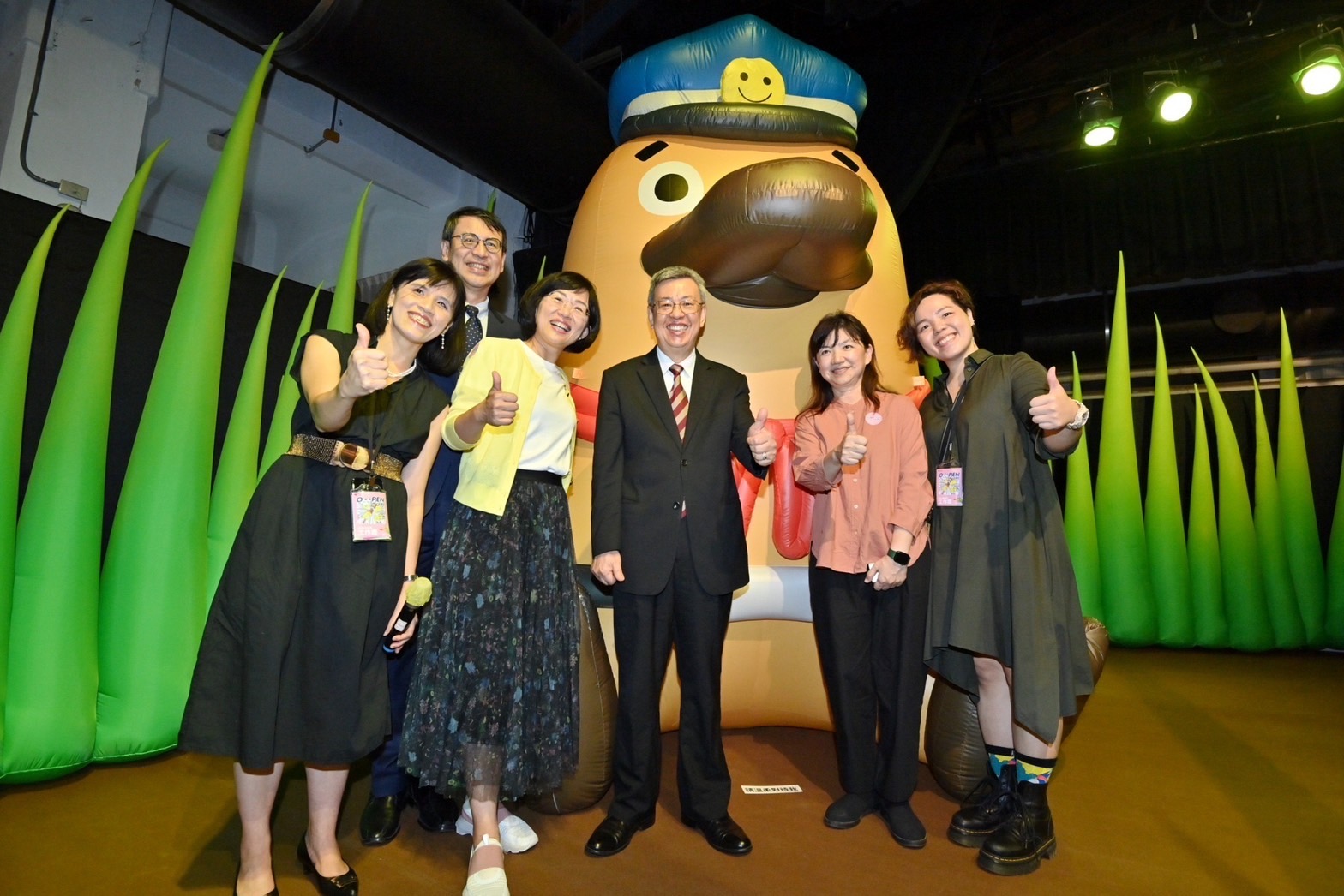 陳院長到場後,首先欣賞「MIT米特薩克斯風重奏團」開幕演奏表演,並於致詞後,手持人氣生物科普漫畫主角「動物警探達克比」玩偶與貴賓們於座位上進行大合影,為活動正式揭開序幕;隨後,在「親子天下」林欣靜總編輯導覽下,參觀「打開達克比的縮小糖」、「打開圖書館員的秘密」及「打開樂樂的遊戲基地」等展區,聽取策展理念、推展兒童台語學習及經典童書作繪者創作歷程等介紹。