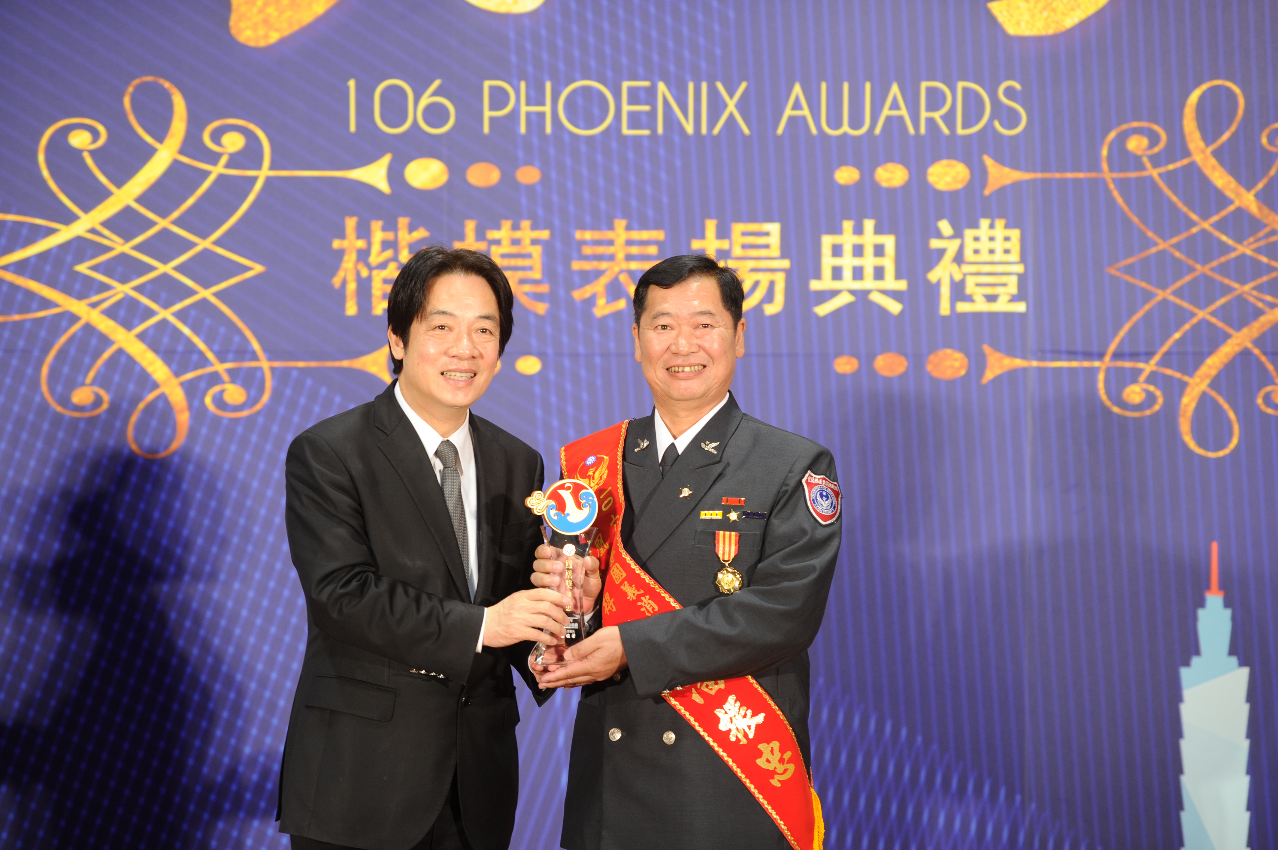 行政院長賴清德今(18)日出席「106年度鳳凰獎楷模表揚典禮」時表示,內政部每年舉辦「鳳凰獎」,藉以向犠牲奉獻的消防人員、義消人員以及相關志工表達感謝,並推廣鳯凰楷模的精神,期盼各縣市消防弟兄未來工作更加順利。