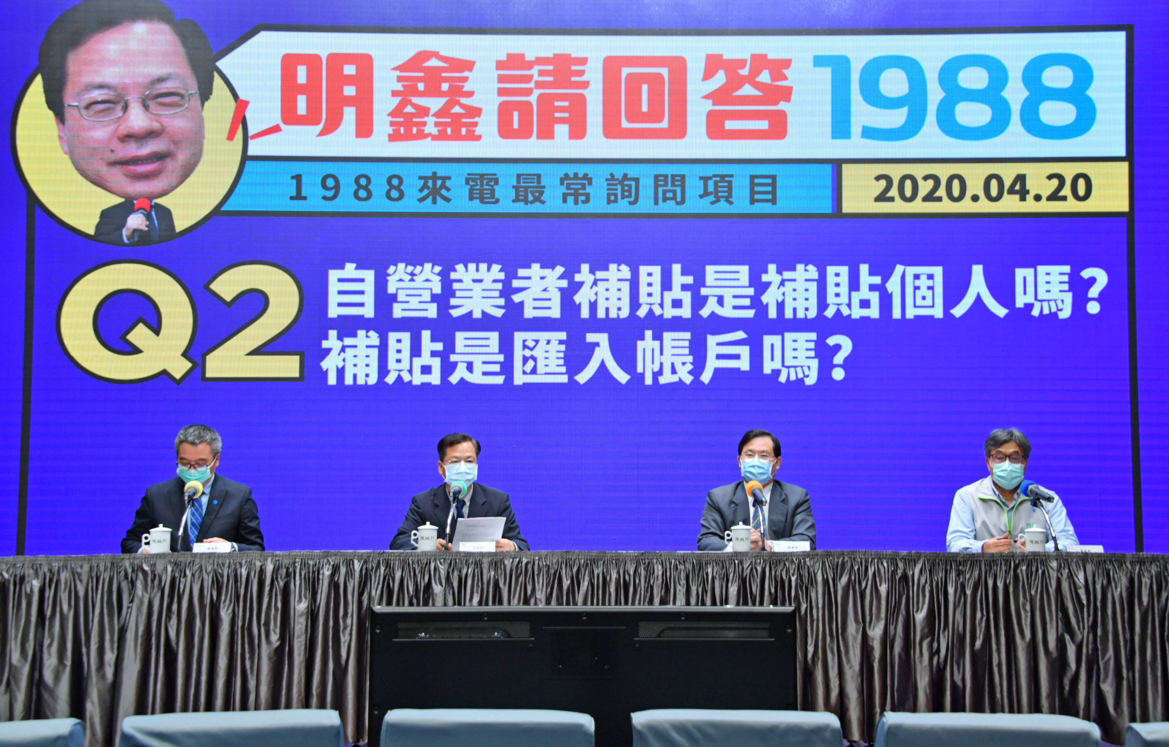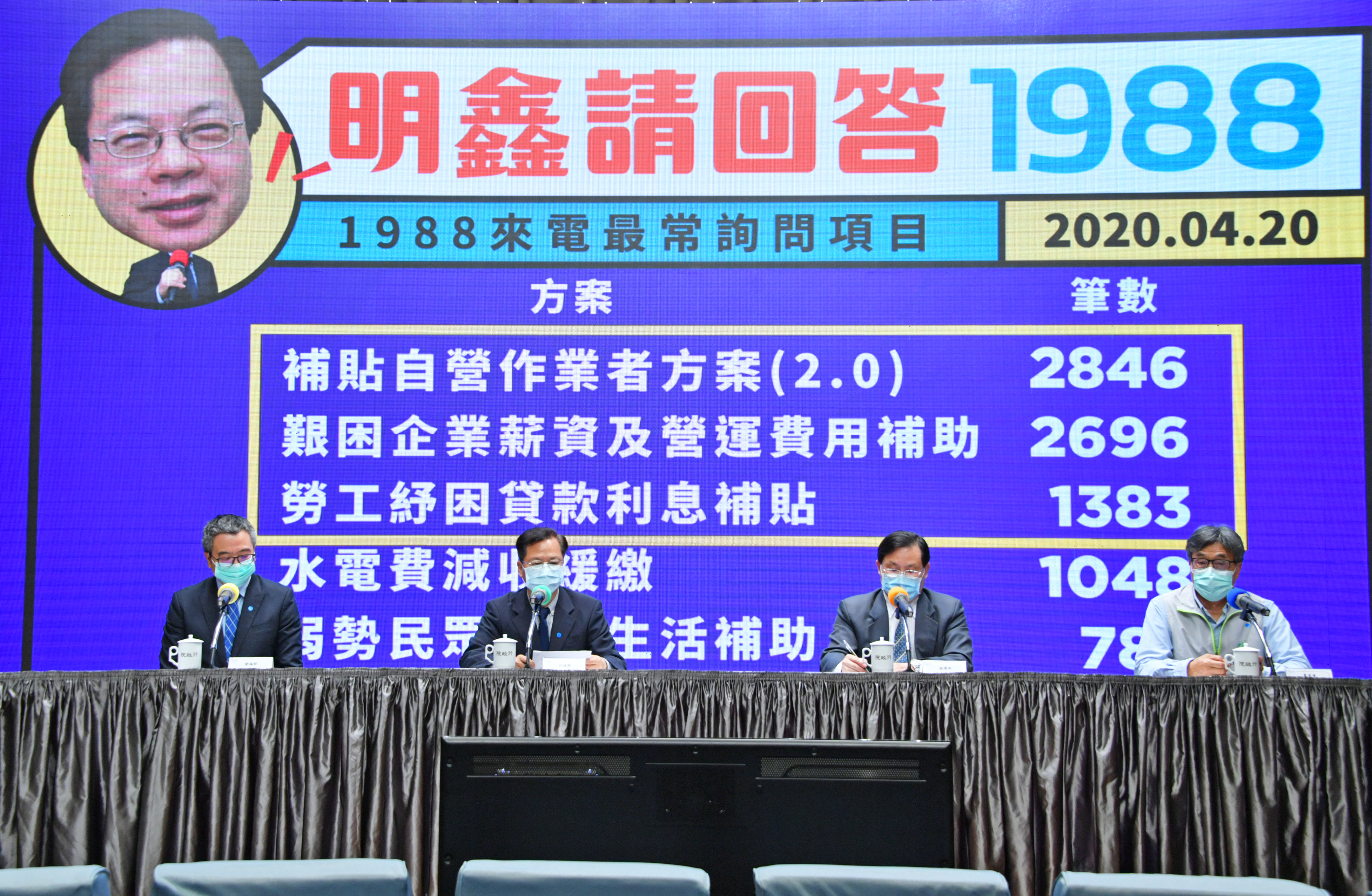 龔政委進一步指出,「1988」諮詢專線在上週最常被詢問的問題為「補貼自營作業者方案」、其次為「艱困企業薪資及營運費用補助」,第三名為「勞工紓困貸款利息補貼」,均與就業相關。「補貼自營作業者方案」部分,勞動部已開始受理,民眾在5月20日前可透過職業工會申請;「艱困企業薪資及營運費用補助」,相關部會亦開始受理並進行前置作業,至於「勞工紓困貸款利息補貼」也會儘快正式推出。