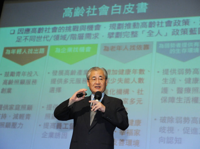 行政院長毛治國今(23)日出席「2015銀浪新創力國際週國際論壇暨工作坊」時,以「高齡社會新未來」為題進行簡報,說明政府因應高齡化社會來臨,在國家政策方面所進行的規劃與調整。