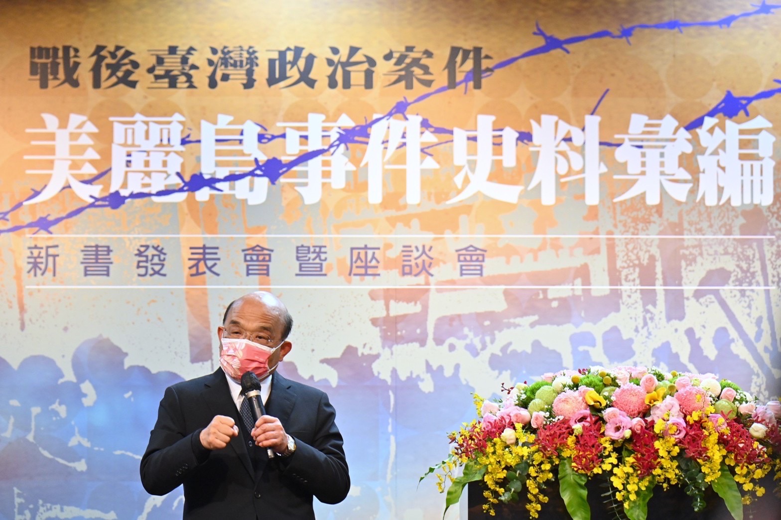 行政院長蘇貞昌今(19)日出席「戰後臺灣政治案件-美麗島事件史料彙編」新書發表會暨座談會時表示,美麗島事件是臺灣人民受到當時威權政府打壓及打拚的一段歷史,歷史真相至為重要,感謝文化部用心推動歷史保存,以及國史館與國家人權博物館合作出版史料彙編,讓民眾得以不忘前人的犧牲奉獻。臺灣歷史尚有許多真相待挖掘,應以淺顯易懂的方式記錄這些歷史事件,使其能夠流傳下來,政府會繼續努力,也希望大家持續支持政府,讓臺灣能永遠做自己的主人。