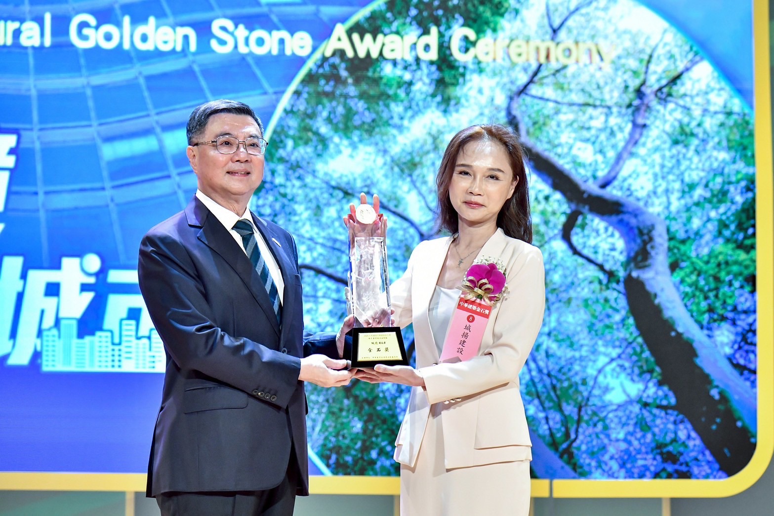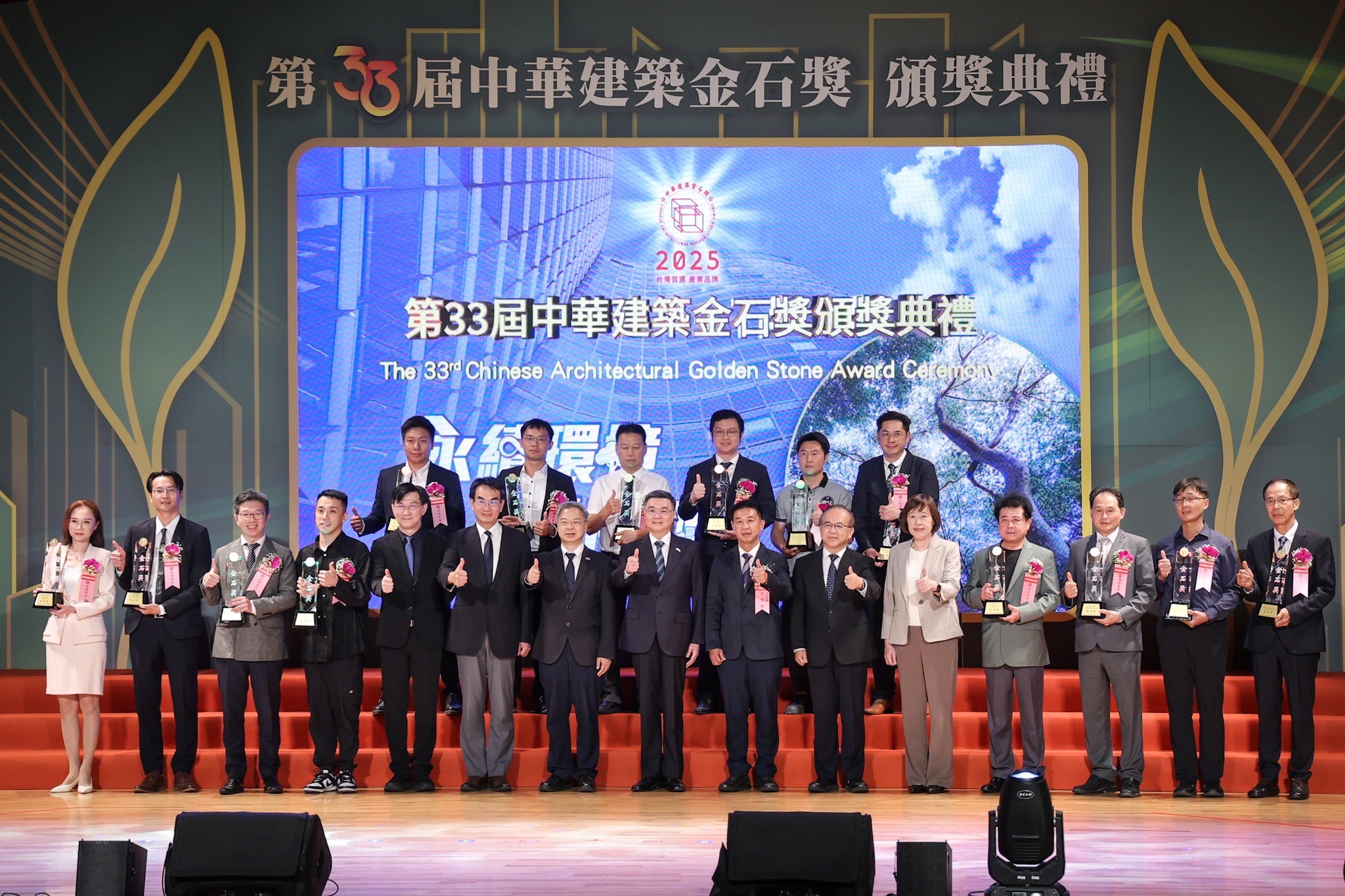 致詞結束後,卓院長觀賞「評審過程暨優良施工品質類評審的話」及「優良施工品質類得獎公司作品」影片,並頒發「金石獎」予15家「優良施工品質類」獲獎者及合照。最後,卓院長與經濟部龔明鑫部長、數位發展部林宜敬部長、內政部董建宏次長、交通部陳彥伯次長、國家發展委員會高仙桂副主委、中華建築金石獎主任委員許智傑立委及所有得獎者於臺上合影留念,現場氣氛熱絡。