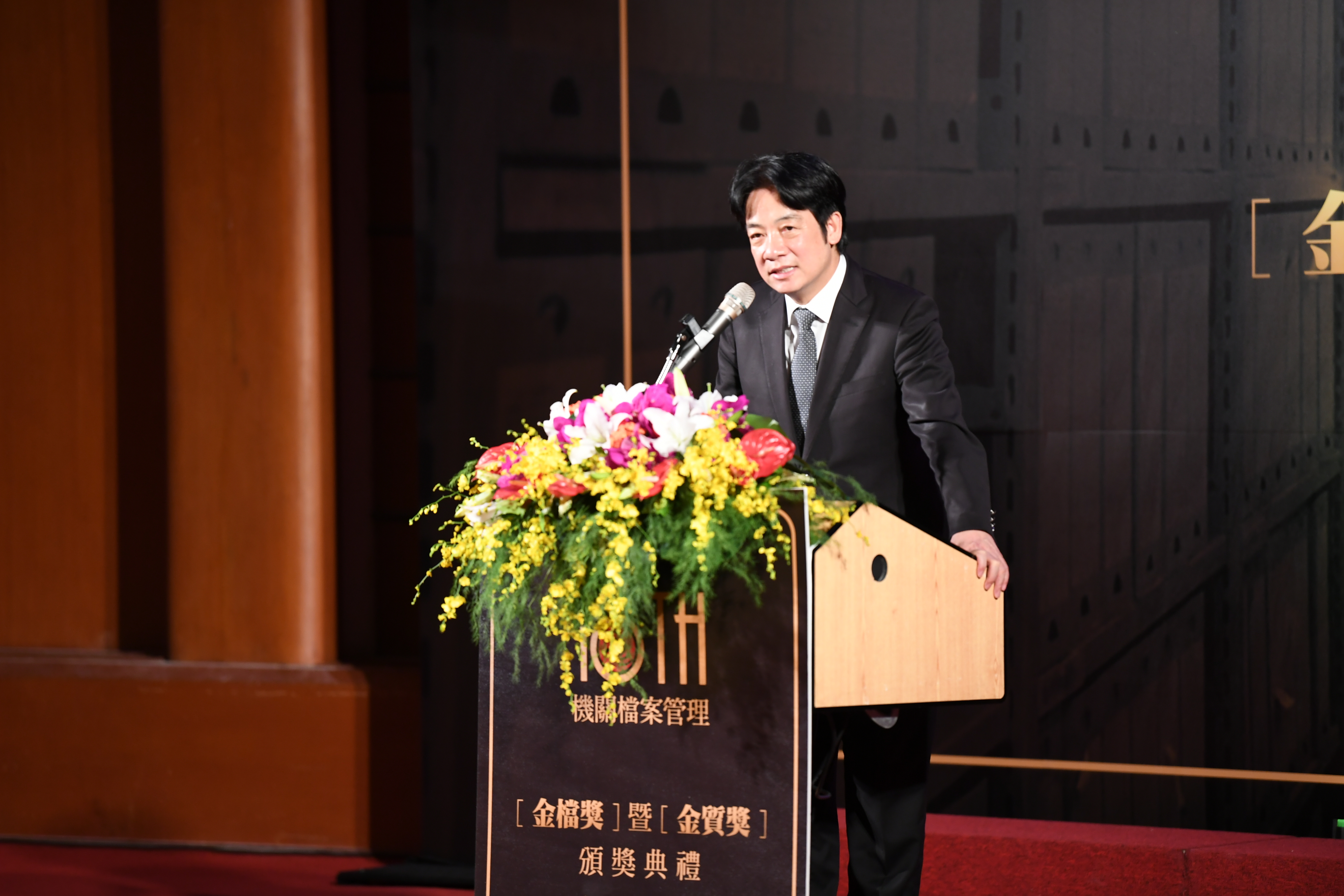 行政院長賴清德今(12)日出席「第16屆機關檔案管理金檔獎暨金質獎頒獎典禮」時表示,圖書館、博物館與機關檔案為知識的三大來源,國家機關檔案可呈現過去機關努力的績效,機關也可從中進行研究及檢討、改進,勉勵全國所有機關持續精進,將檔案整理工作愈做愈好。