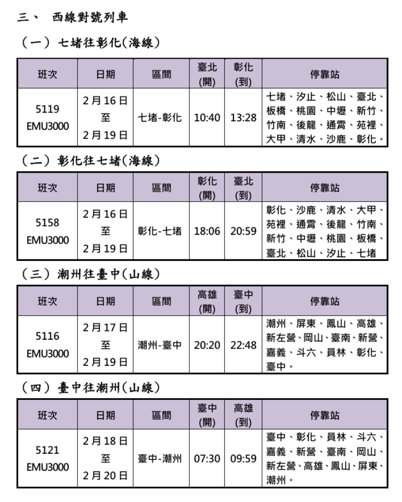 臺鐵公司因應115年春節連續假期疏運旅客需要,自115年2月12日(星期四)起至2月23日(星期一)計12天,全線加開各級列車共計271班。其中包含東部地區實名制列車8班、彰化-臺北-花蓮EMU3000型自強號列車20班、臺北-高雄-臺東EMU3000型自強號6班、七堵-彰化(海線)EMU3000型自強號列車8班、臺中-潮州EMU3000型自強號6班;另為加強疏運旅客,115年2月12日至2月23日暫停發售親子車廂車票,改以一般車廂方式售票。