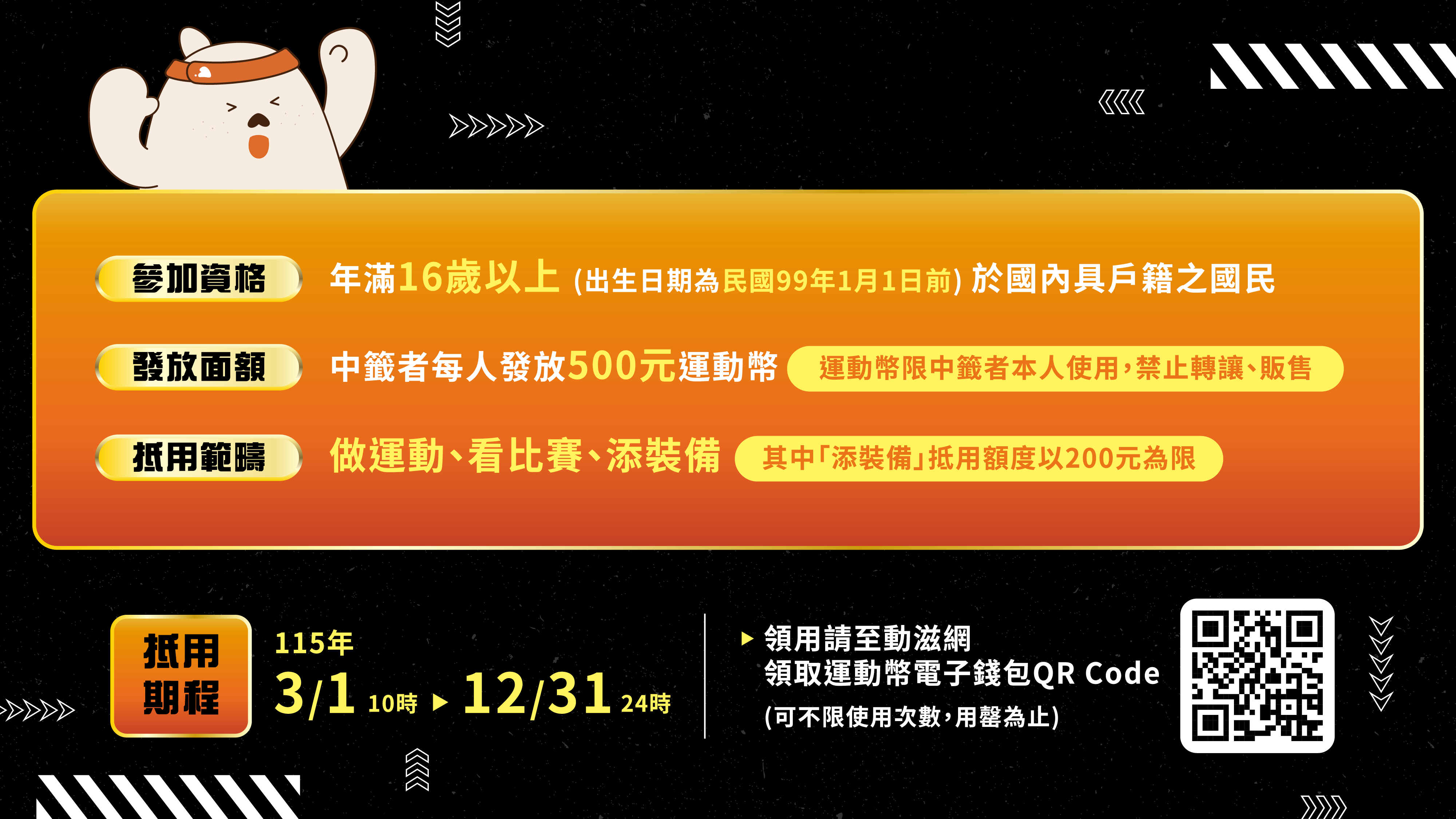 為鼓勵全民培養運動與觀賞賽事消費習慣,運動部推動運動幣政策,已於115年2月12日順利完成公開抽籤活動,並於3月1日起開放中籤民眾至動滋網領取500元運動幣,可於經審核通過之合作店家消費抵用,期盼透過政策誘因,降低民眾運動消費的門檻,促進運動產業發展。