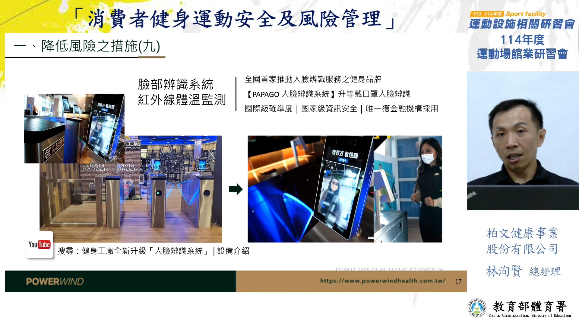 • _附件照片2_1140730_1_柏文健康事業股份有限公司總經理林洵賢分享「消費者健身運動安全與風險管理」,提升場館管理者在運動安全上的風險意識與處理能力。  共2張