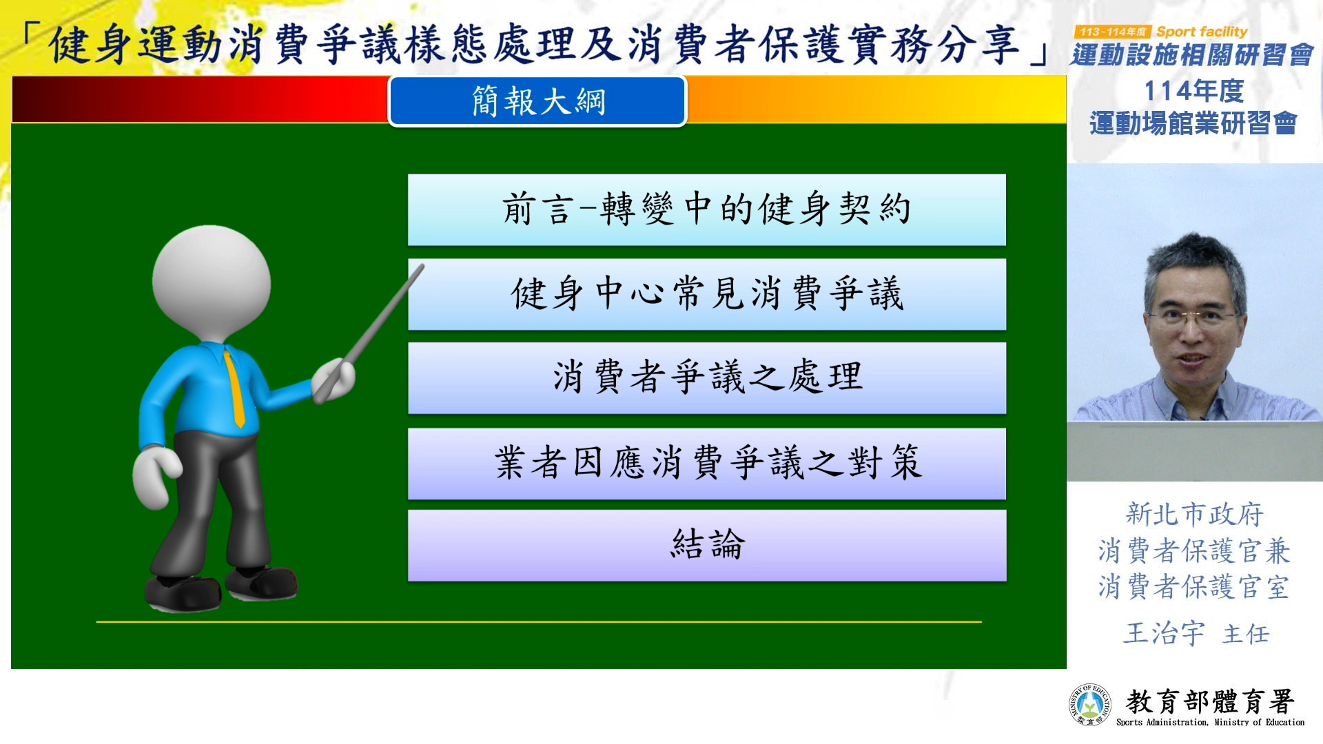 • _附件照片1_1140730_1_新北市政府消費者保護官兼消保官室主任王治宇分享「健身運動消費爭議樣態處理與消費者保護實務」,深入剖析場館常見消費爭議案例,並提出實務處理機制與預防策略,協助場館提升前線應對能力與消費者信賴。  共2張