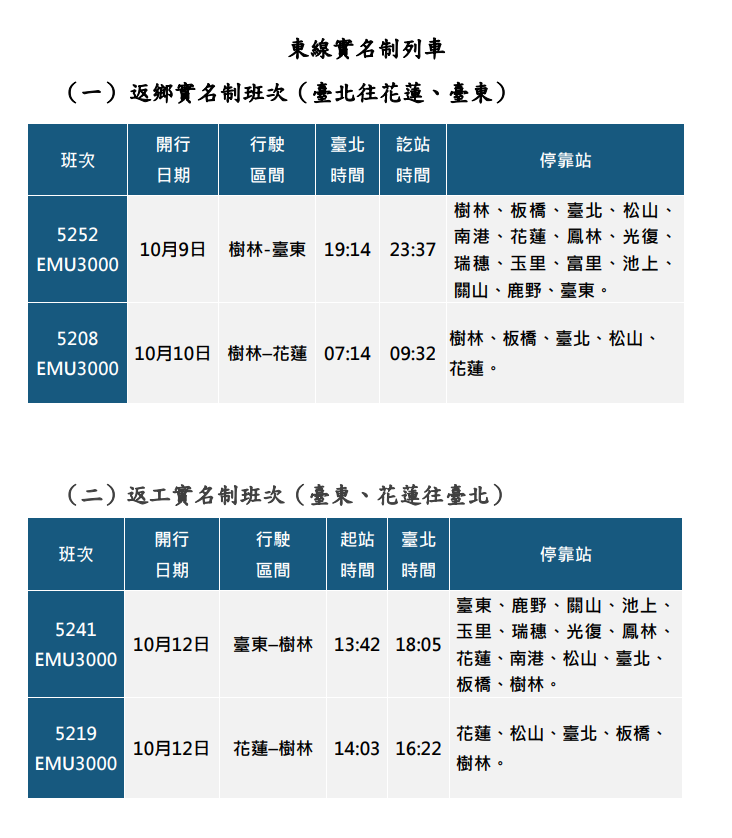 另10月9、10及12日加開之實名制列車,將於9月11日(星期四)0時起開放設籍於花蓮縣、臺東縣之現住人口與國民身分證統一編號第1碼為U或V及上開兩者之配偶與直系血親1親等國民訂票。
