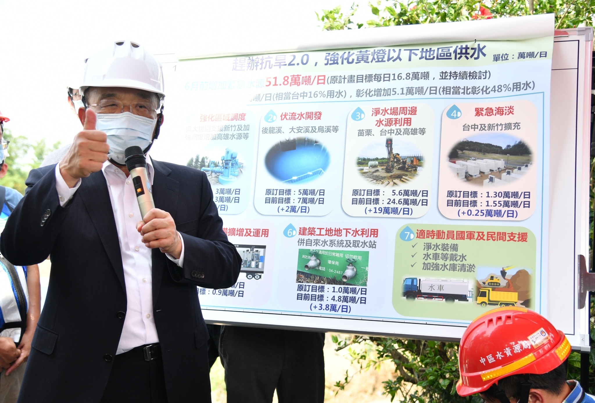 行政院長蘇貞昌今(11)日至苗栗視察「竹南頭份水資源回收中心」時表示,臺灣水情吃緊,政府3年前就用前瞻基礎建設預算進行水井挖掘等抗旱整備工作,正因為提早部署,現在還能緊撐抗旱。蘇院長感謝所有同仁的付出......【詳全文】