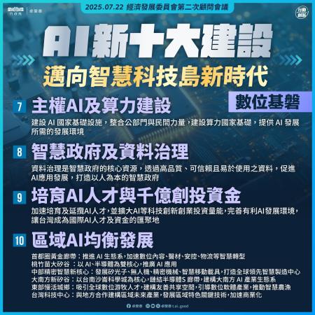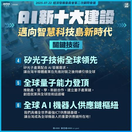 在「關鍵技術」部分,卓院長強調矽光子、量子科技、智慧機器人及無人載具等AI關鍵技術發展極為重要,請國家科學及技術委員會會同相關部會,邀集產、官、學、研及新創團隊,共組團隊共同努力,延續臺灣既有優勢,持續提升產業競爭力及人民生活。此外,「數位碁盤」涵蓋法規、人才、治理、算力與資料等面向,是推動AI新十大建設的必要基礎,也是AI迅速發展的關鍵,請國發會、國科會及數發部整合顧問所提意見,納入未來參考,以AI促進區域均衡發展,打造一個處處都能安居樂業、享有AI服務的國家。卓院長也請相關部會針對「AI新十大建設」提出指標性的關鍵亮點,包括促進產業升級、提升生活品質及整體社會環境改善等,讓民眾確切明瞭相關施政方向。