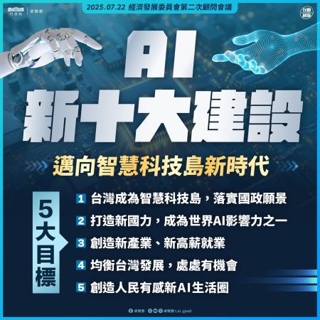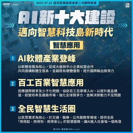 接續,卓院長聽取「AI新十大建設推動方案(草案)」報告後指出,「AI新十大建設」涵蓋「智慧應用」、「關鍵技術」及「數位基磐」等三大層面,並有五大目標,包括以「智慧應用」升級軟體產業與轉型傳統產業、因應少子化,解決缺工,以及提供人民便利舒適的AI生活;以「關鍵技術」布局前瞻技術,鋪墊AI及經濟前景;以「數位基磐」打造主權AI展現國力。卓院長表示,在「智慧應用」部分,各國已視AI為國力競爭關鍵,將顯著影響國家安全及經濟發展前景。臺灣擁有最靈活的資通訊(ICT)產業及領先全球的半導體製造實力,期盼透過打造具本土特色的軟體平臺及創新服務,讓AI深入百工百業,協助中小微企業突破規模限制,創造新價值,實現「AI產業化、產業AI化」目標,讓我國產業升級路徑更明顯,增加整體競爭力及韌性。
