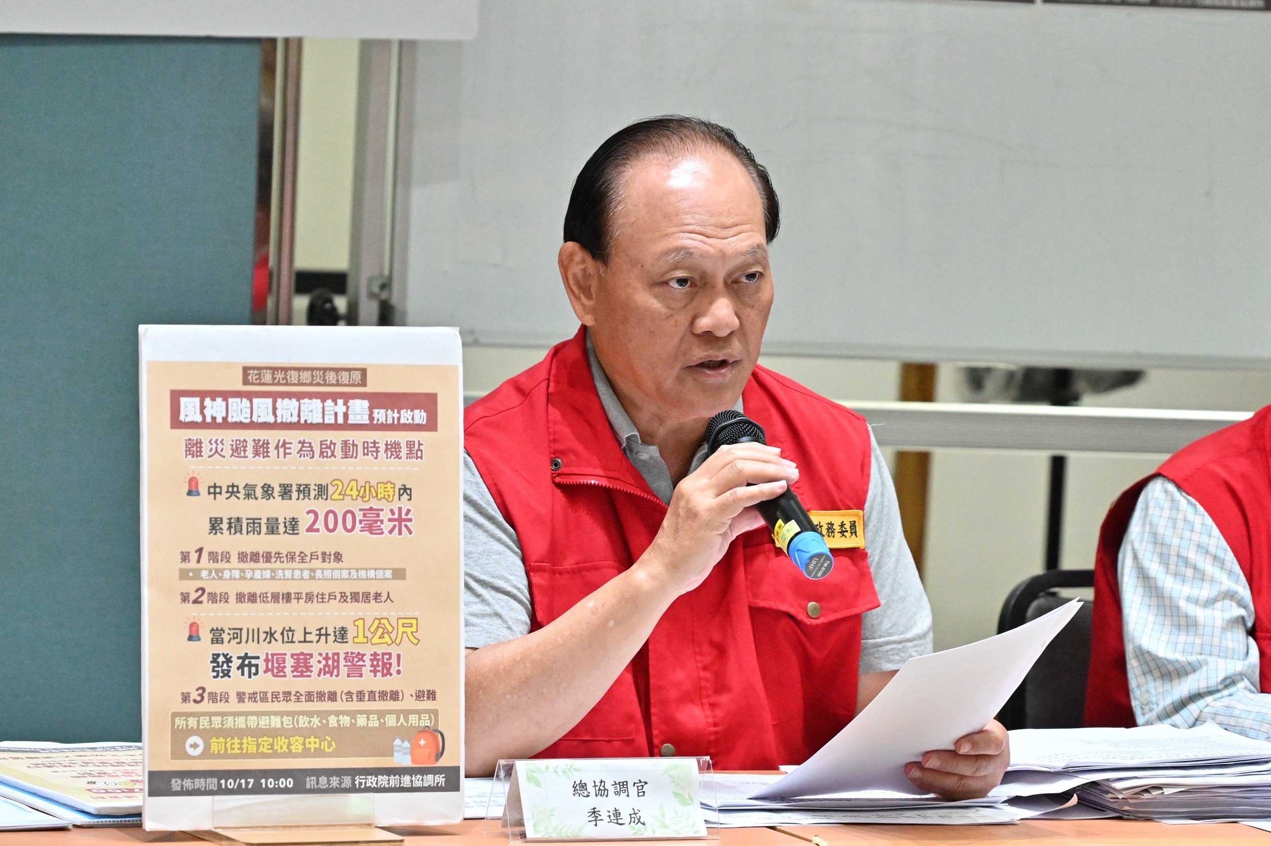針對撤離人數,季總協調官表示,經內政部民政司、花蓮縣府民政處及鄉鎮公所近日精算,此次警戒區域保全戶總人數為6,784人,實際居住人數為4,238人,並分為向外依親784人、疏散撤離999人、垂直避難2,443人、特殊需照顧族群12人,而目前已在收容中心居民為221人。有關疏散撤離車輛部分,季總協調官指出,運送一般民眾車輛計29輛,包含遊覽車、中型巴士、計程車、國軍中型戰術輪車等;運送特殊族群(如獨居長者、病患等)車輛計26輛,包含救護車、復康巴士、長照車、計程車、中型巴士等;部分民眾採步行方式至光復國小收容中心避難。