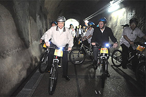 為了親自體驗由「舊草嶺隧道」蛻變成「觀光鐵馬隧道」的魅力,吳院長特地騎上自行車在隧道內試騎約500公尺,對於隧道內的通風、照明、車道等設施讚不絕口。舊草嶺隧道興建於日治大正10~13年(西元1921~1924年),全長2,167公尺,在觀光局與鐵路局協調並重新規劃整建下,歷時1年,終於將這條塵封20多年的長隧道,蛻變成為台灣最長的「觀光鐵馬隧道」,這也是交通部「東部自行車路網示範計畫」的一環。自97年8月10日開通至今,不僅為福隆地區帶來約70萬人次的觀光人潮,同時也帶動周邊便當業者每月營業額約900萬元、自行車業者約600萬元,充分展現觀光帶動地方經濟活絡的商機。