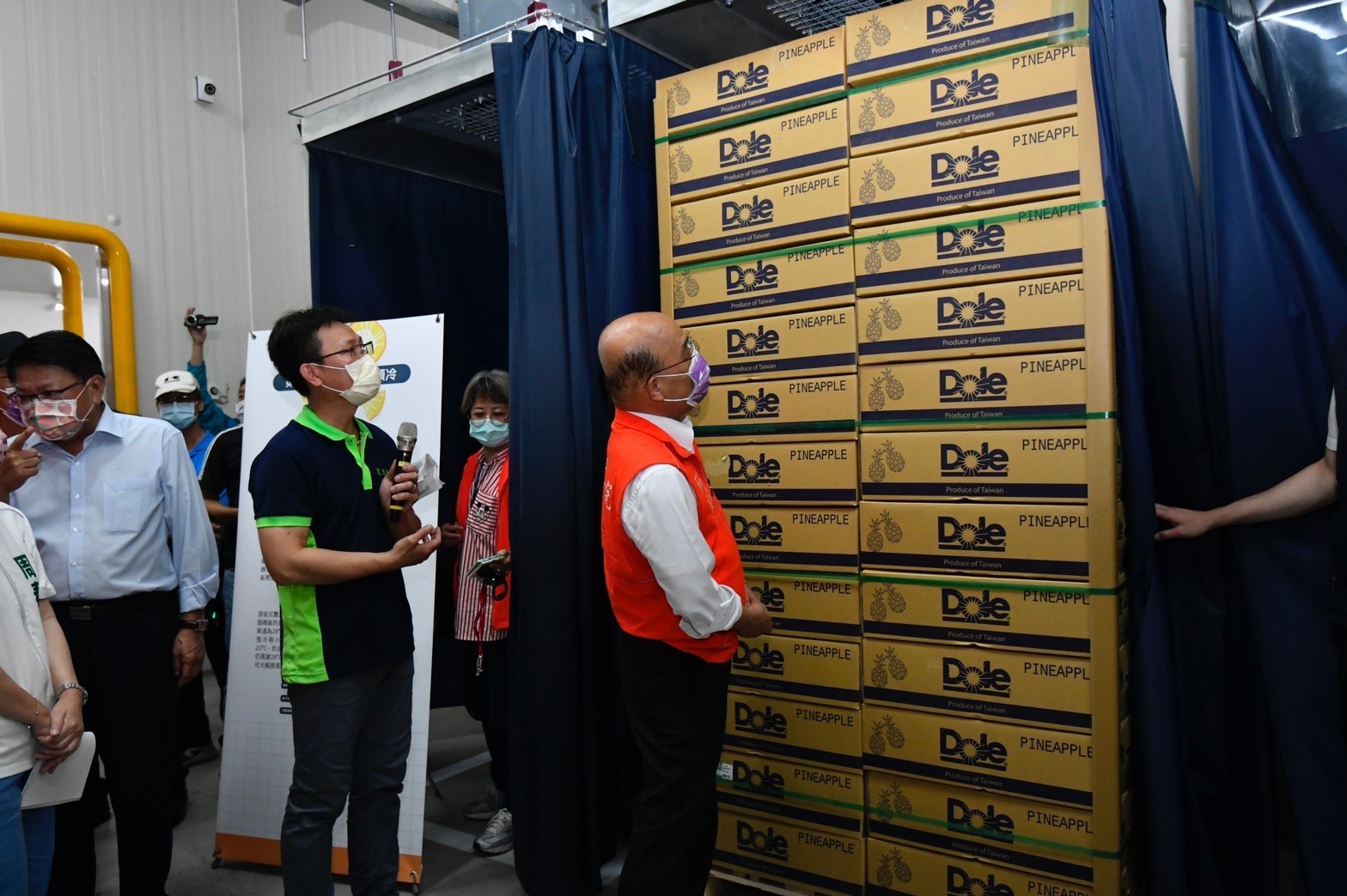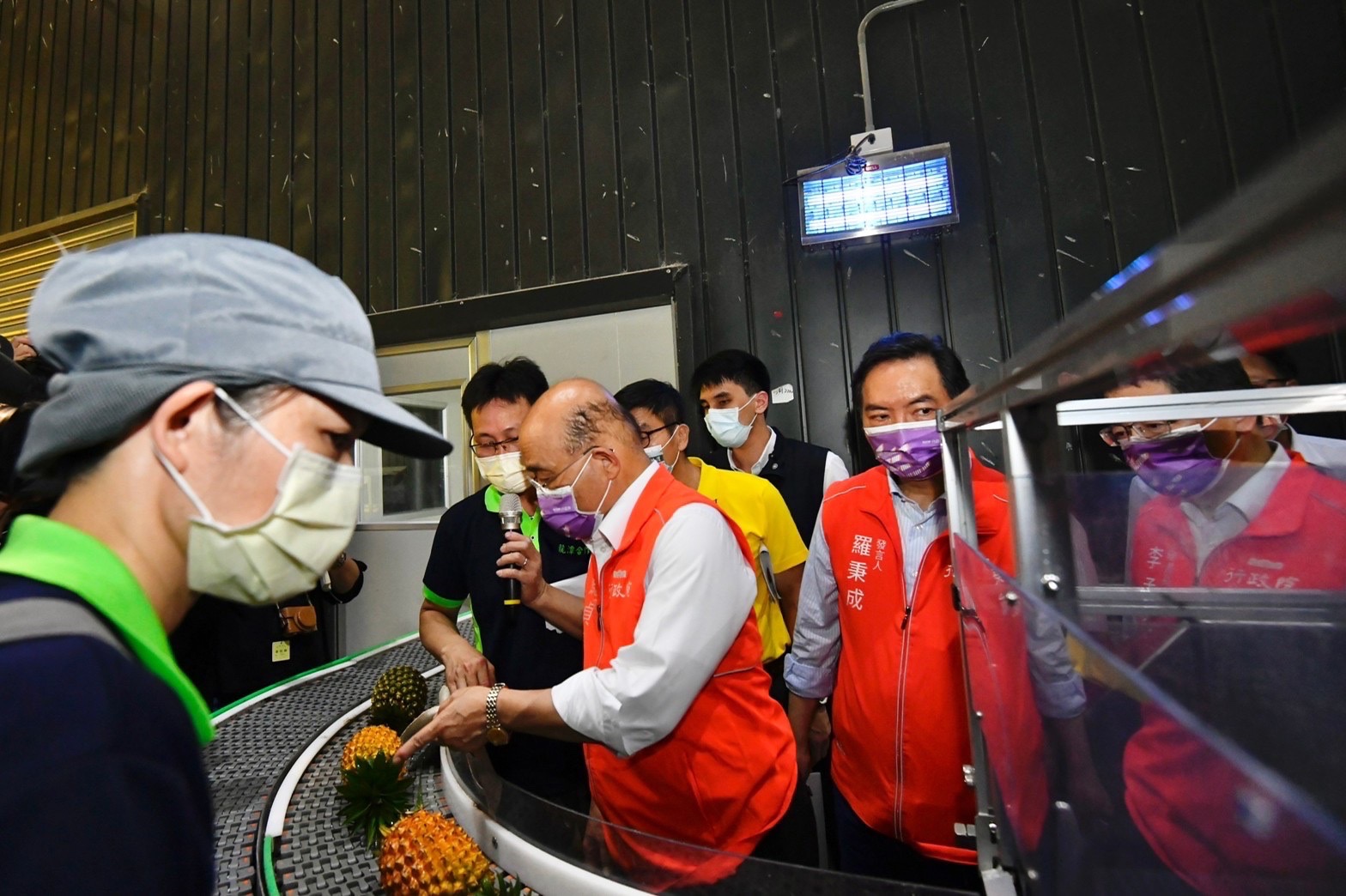 關心臺灣鳳梨產銷情形,蘇院長今日也特別前往內埔鄉龍潭果菜生產合作社瞭解鳳梨冷鏈流程。蘇院長指出,危機就是轉機,臺灣去年鳳梨出口遭受中國禁銷,卻愈挫愈勇,今年1至5月產地平均價格每公斤24.4元,較去年同期(中國禁銷時期)每公斤22.3元,增加2.1元,顯見相關措施已發揮效果。蘇院長並叮嚀包裝場應朝無人操作、電腦操控的方向設計,並建議針對不同國家的飲食習慣,研發不同裁切、包裝方式,同時亦可搭配冷鏈保存;此外,包裝場亦可開發年輕人喜愛、適合小資族的包裝,讓行銷方式更多元。此行院長也特別推薦現場展示的鳳梨果汁、冰淇淋、鳳梨醬與蔭鳳梨等鳳梨製品。