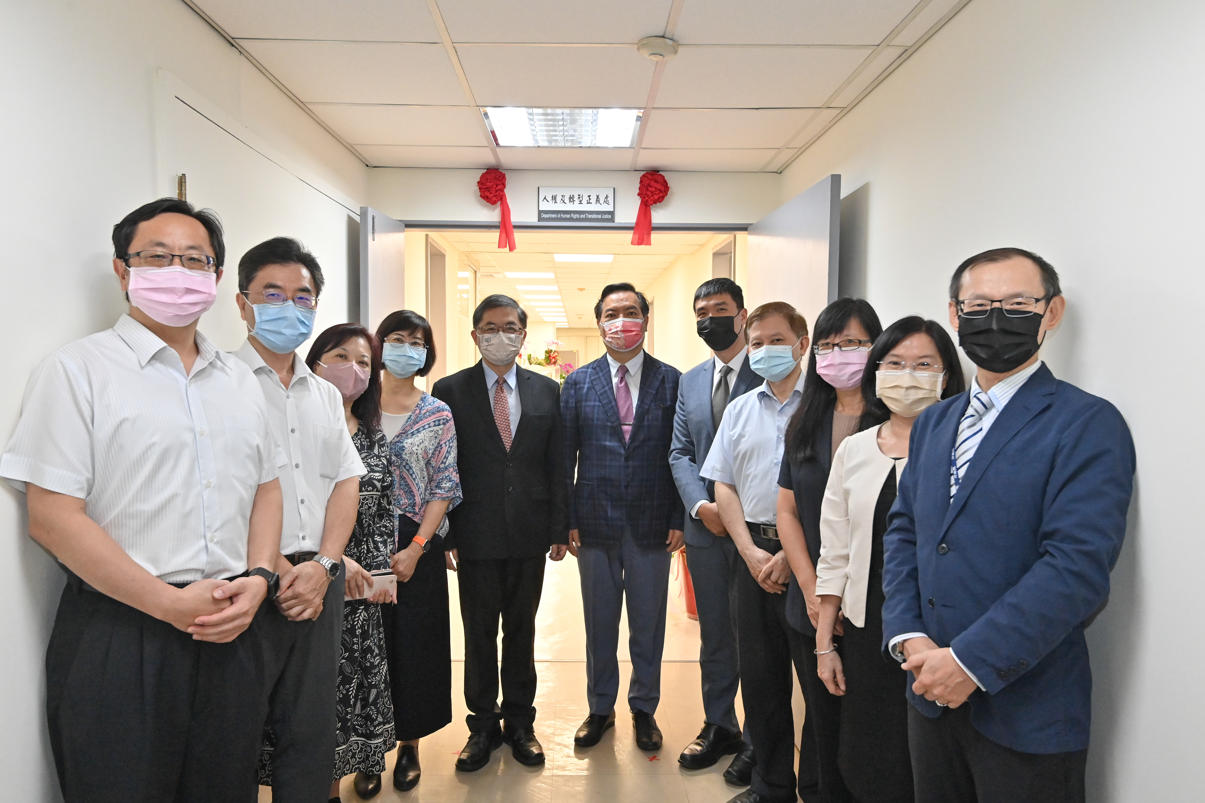 致詞結束後,李秘書長與羅政委兼發言人於甫落成完工的人權處新辦公室前,在觀禮主管及人權處全體同仁的見證下,拉開辦公室招牌上的紅布綵帶,圓滿完成揭牌儀式。