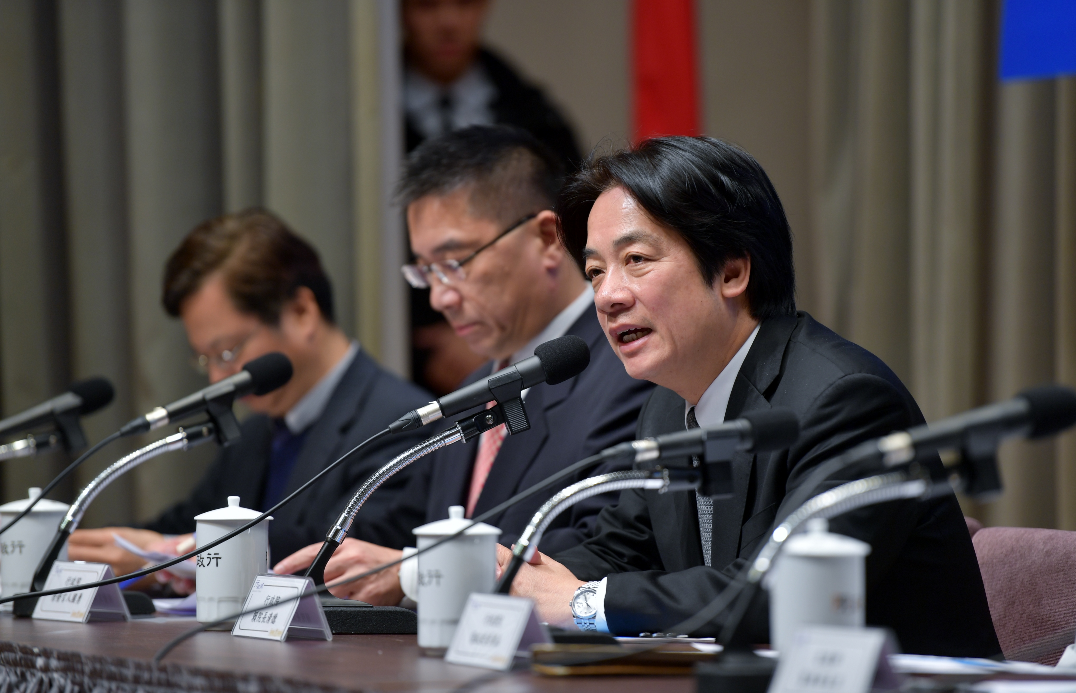 今日陪同院長出席記者會的有行政院政務委員張景森、發言人徐國勇、環保署長李應元、交通部長賀陳旦及經濟部次長龔明鑫。
