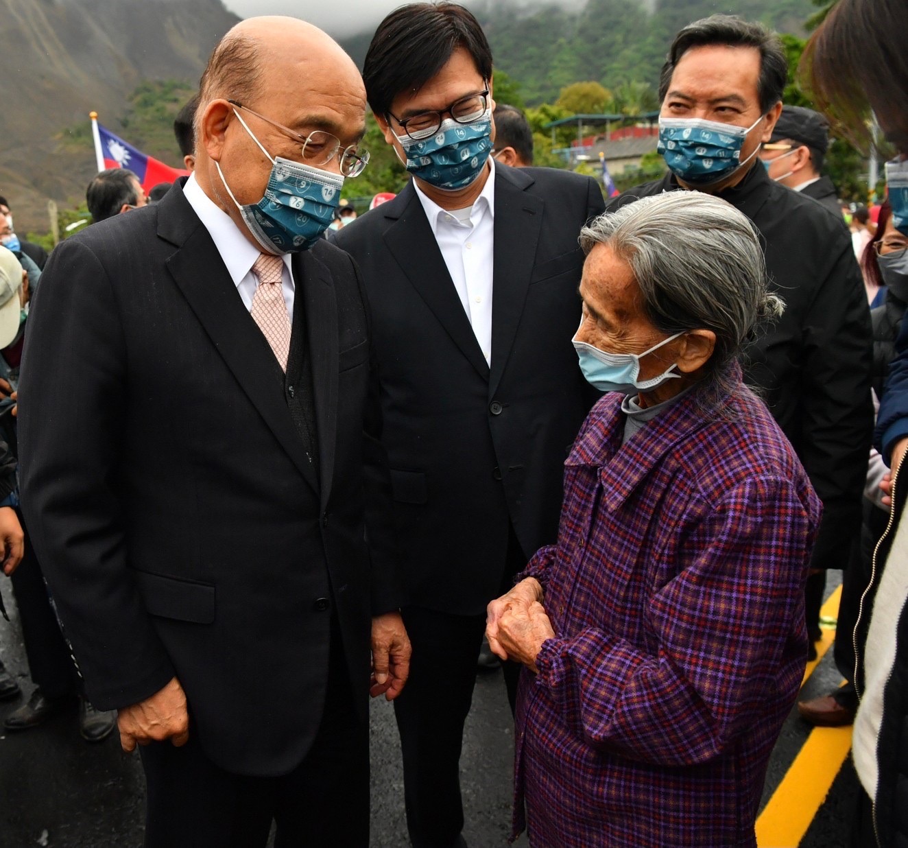 此行蘇院長與陳其邁市長共同接受祥獅獻瑞,並手舉好彩頭及鳳梨,祝福剪綵儀式順利。隨後,院長與現場嘉賓共同觀賞寶來一橋改建工程紀錄影片,並頒發獎牌及致贈加菜金,感謝工程人員的辛勞與付出。在剪綵儀式完成後,蘇院長與陳其邁市長分別牽著98歲的耆老曾塗生先生、100歲的耆老徐魏月嬌女士,與寶來國小學童等人一同踩橋,展現新、舊寶來一橋繼往開來的傳承意義。