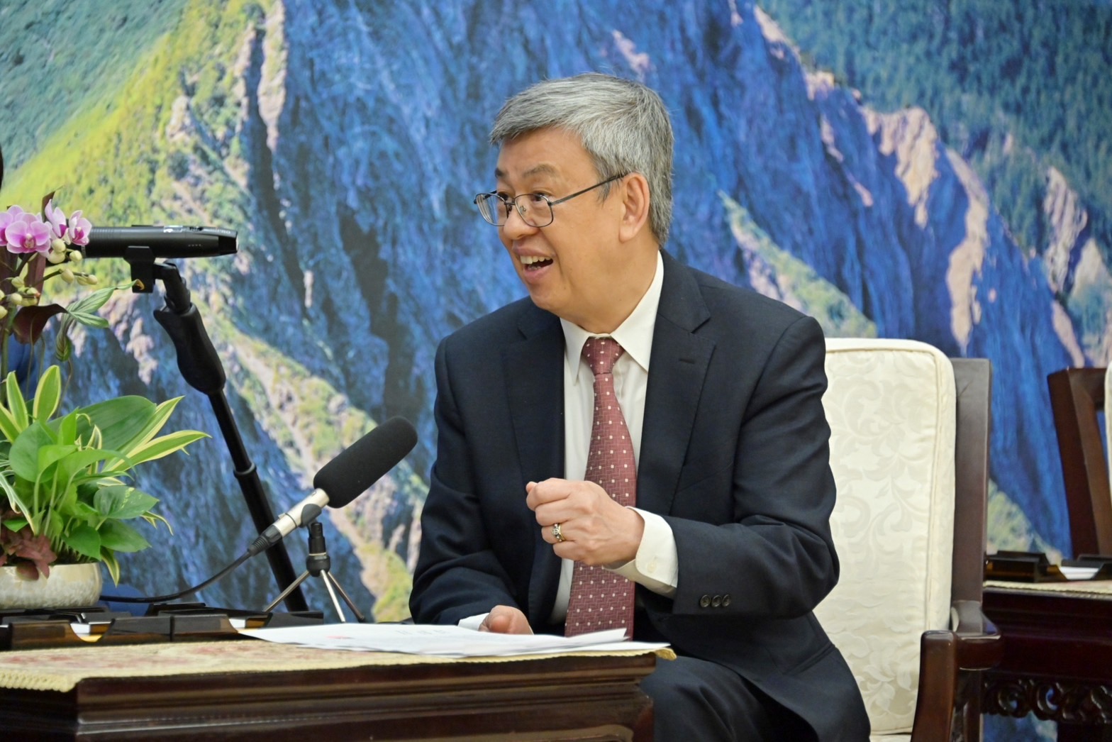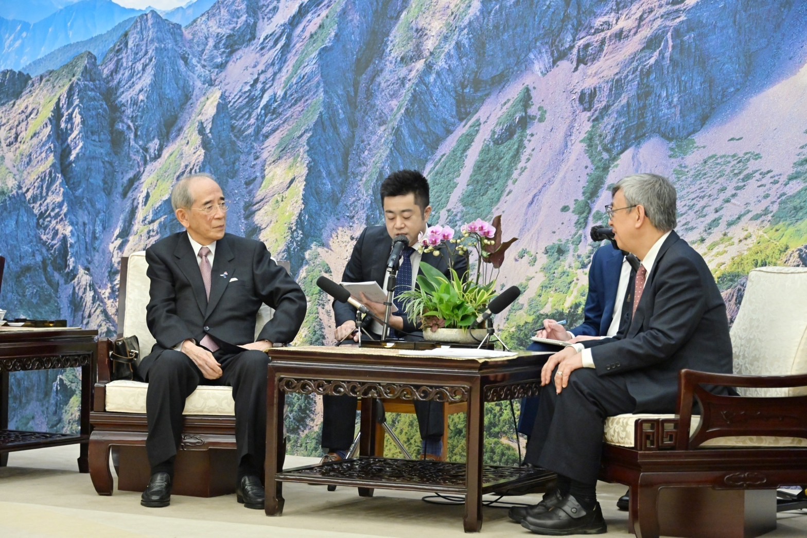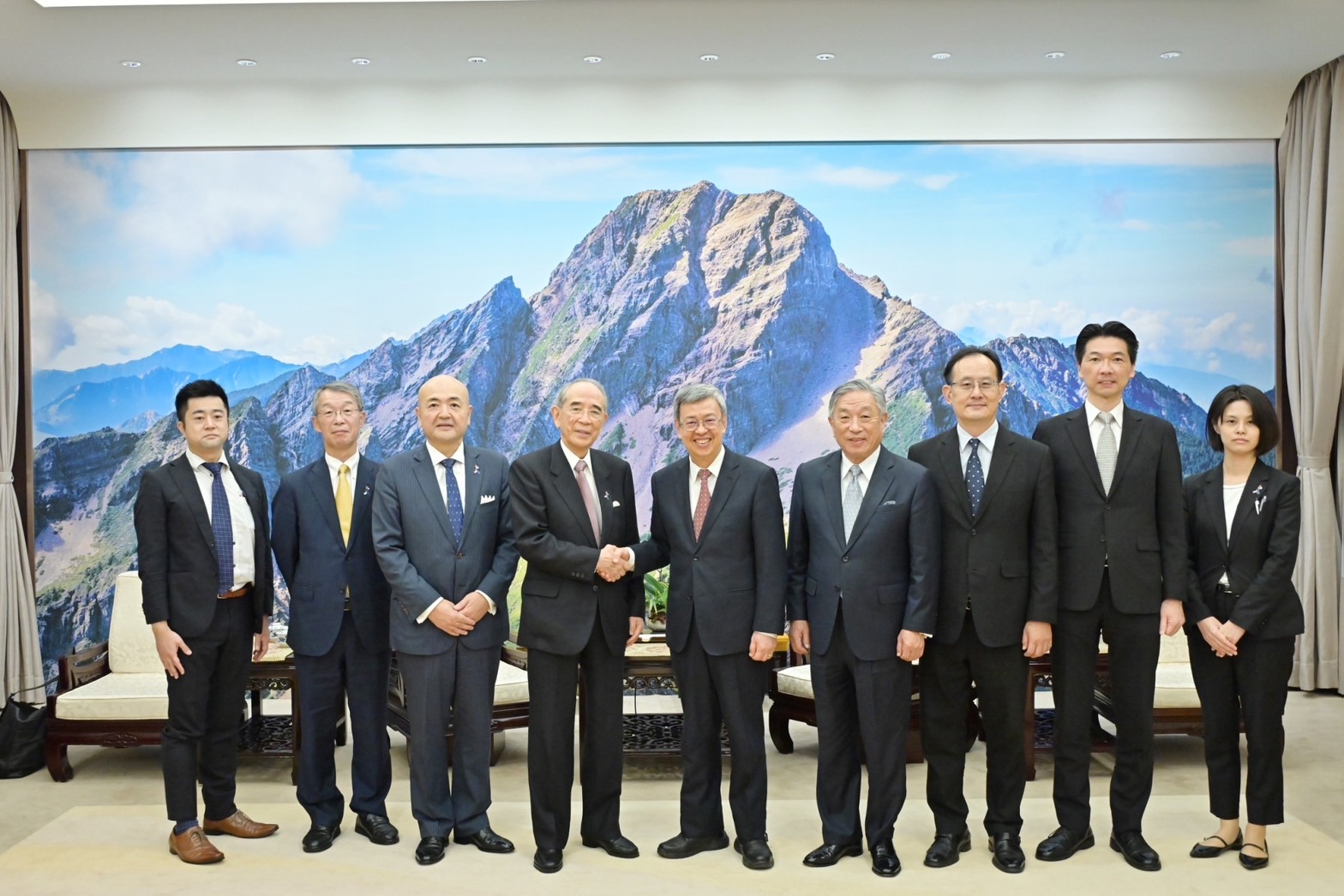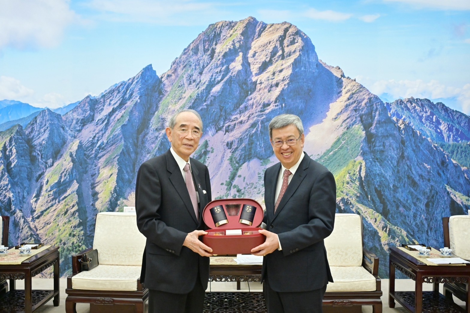 訪賓一行尚包括昭和電工株式會社皆川修名譽顧問秘書及日本台灣交流協會東京本部紺野紗佑里總務部副長,由外交部田中光次長及日本台灣交流協會台北事務所片山和之代表陪同,前來行政院拜見陳院長,臺灣日本關係協會陳志任副秘書長也在座。此行,陳院長致贈大橋光夫會長「飄花寶閣禮盒」,以及致贈皆川修名譽顧問秘書及紺野紗佑里總務部副長「織藍禮盒」;大橋光夫會長則回贈院長日本手工眼鏡盒,雙方並合影留念。
