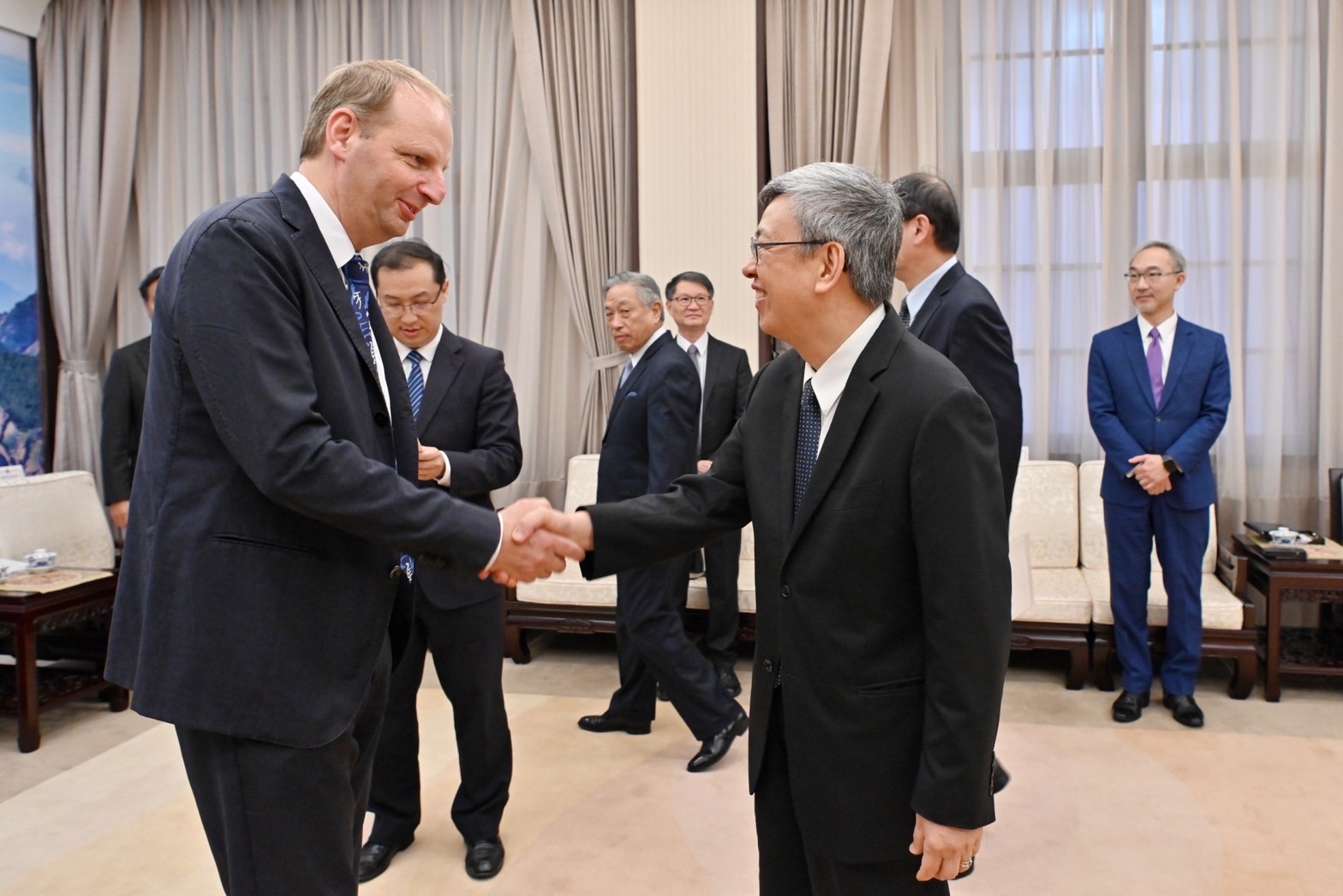 訪賓一行尚包括史岱凡主任(Samse Stefan)、陳蘇珊計畫執行(Chan Susan)、歐莉薇計畫經理(Schlouch Olivia Mehiti)、歐卡薩前資訊長(Alkassar Ammar)、賀曼創始人(Heumann Stefan),由外交部次長田中光、中央研究院法律學研究所所長李建良及德國在臺協會何峰副代表(Andreas Hofem)陪同,前來行政院拜見陳院長,行政院政務委員羅秉成及發言人林子倫也在座。
