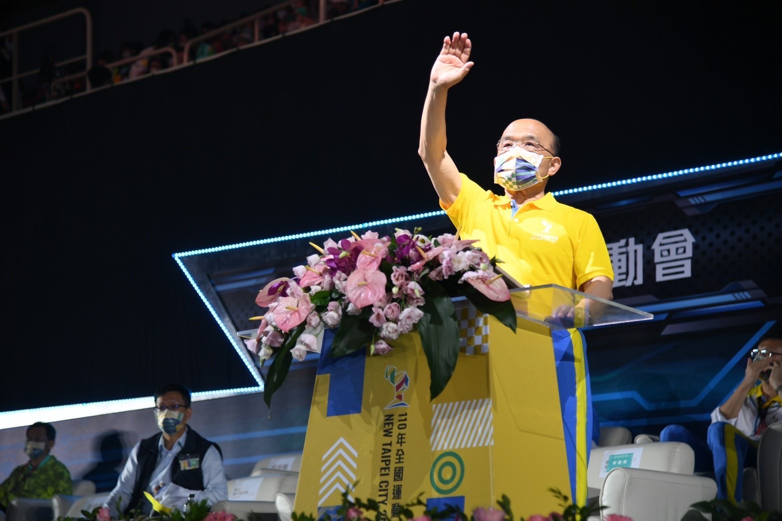 蘇院長表示,臺灣在蔡英文總統領導下,舉國同心,才能在舉世滔滔、疫情嚴峻的此刻,還能舉辦如此大型的運動會;而舉辦大規模運動賽事並不簡單,他特別感謝本屆全運會的主辦城市新北市及侯友宜市長率領的團隊,即使在疫情期間,仍用心且付諸全力準備各項事宜,使今日運動會得以盛大舉辦。院長也請現場觀眾給予侯市長及市府團隊熱烈掌聲,以表達誠摯的謝忱。