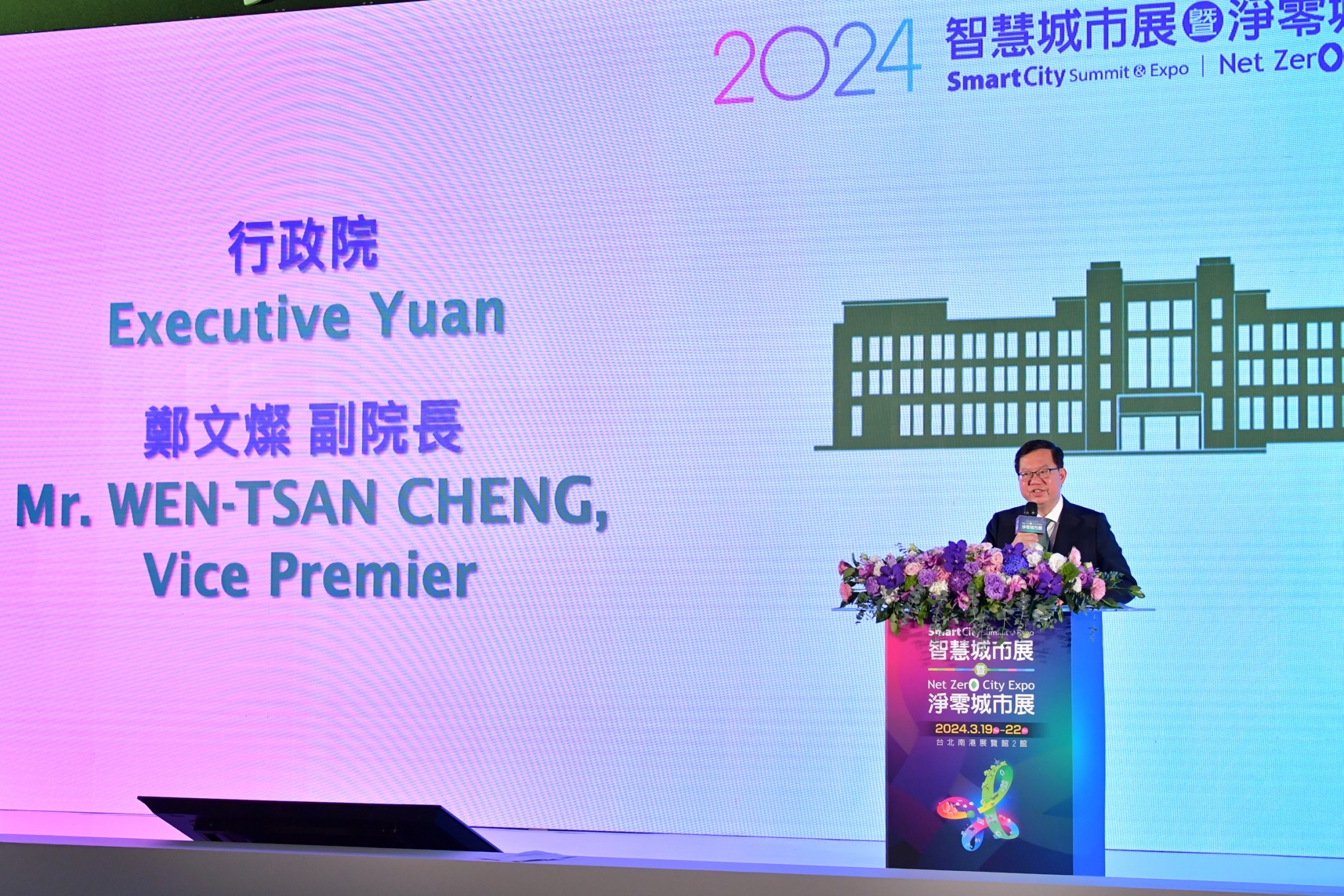 隨後,鄭副院長與總統府林佳龍秘書長、行政院政務委員兼國家發展委員會龔明鑫主任委員、環境部薛富盛部長、外交部陳立國次長、財政部阮清華次長、經濟部林全能次長、交通部胡湘麟次長、國家科學及技術委員會林敏聰副主任委員、金融監督管理委員會蕭翠玲副主任委員、數位發展部數位產業署呂正華署長、高雄市林欽榮副市長、台北市電腦商業同業公會彭双浪理事長、臺灣金融控股股份有限公司沈榮津董事長、台灣智慧城市產業聯盟陳俊聖會長等貴賓,一同在舞臺上以手指滑動平板電腦,為2024智慧城市暨淨零城市展正式揭幕。