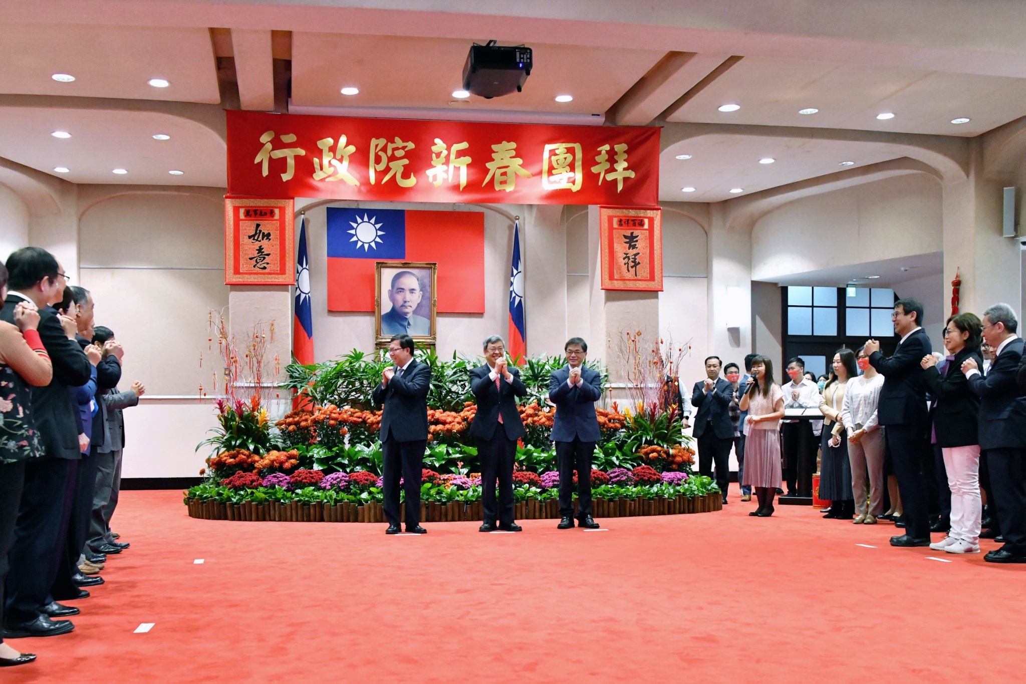 今(15)日為開春後第一個上班日,行政院長陳建仁偕同鄭文燦副院長、李孟諺秘書長、林子倫發言人、政務委員們、各部會首長及院內同仁們於行政院大禮堂出席113年新春團拜活動,拱手互道新年快樂。院長感謝各部會在過去一年的協助與努力,讓臺灣持續向前邁進,內閣團隊依舊會展現最大的決心與熱忱,持續做好福國利民工作,戰戰兢兢地照顧國人的日常大小事,至盼未來臺灣朝野團結一致,打造更溫暖強韌、富強康樂、幸福美滿的國家。
