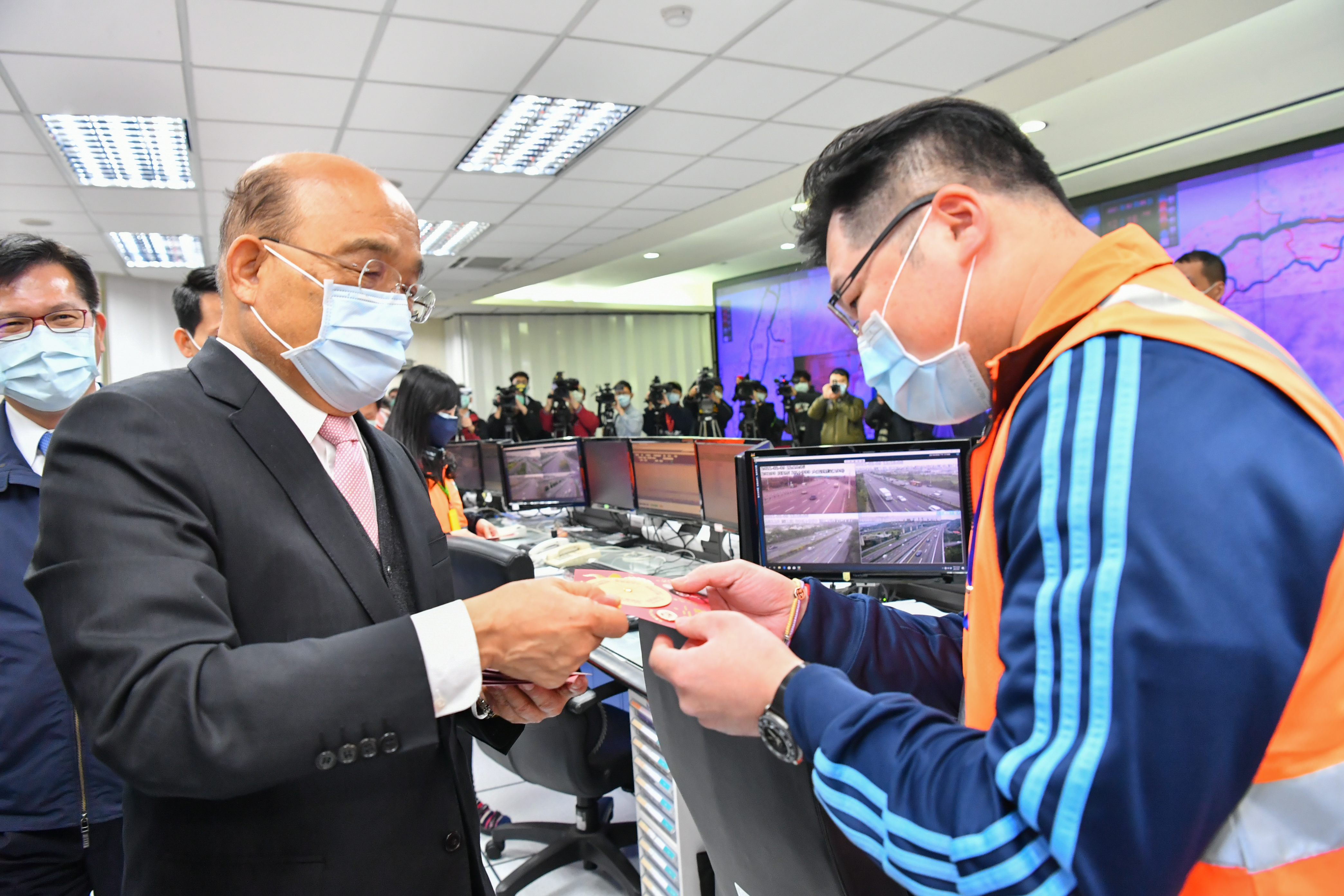 行政院長蘇貞昌今(9)日前往高公局交控中心視察,瞭解春節疏運整備情形。蘇院長表示,一年最大的節日-春節連假即將展開,最大的交通負荷即將進入高峰期,他除了感謝高公局、國道公路警察局所有同仁的辛勞,並請大家做最好的準備,在交通部督導下為國人服務,也呼籲國人同胞一起讓春節交通平安、順暢。