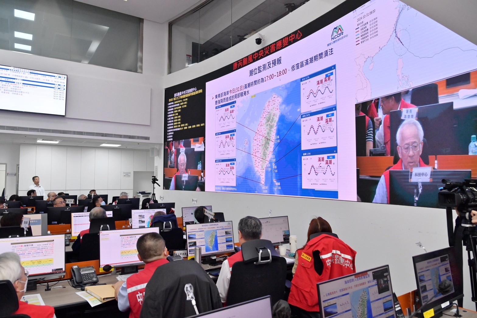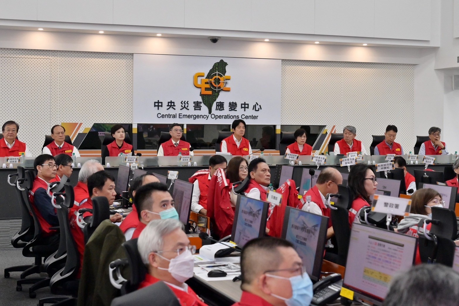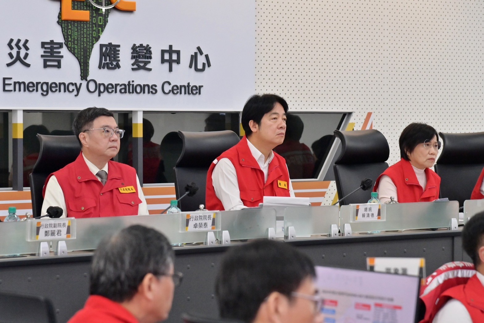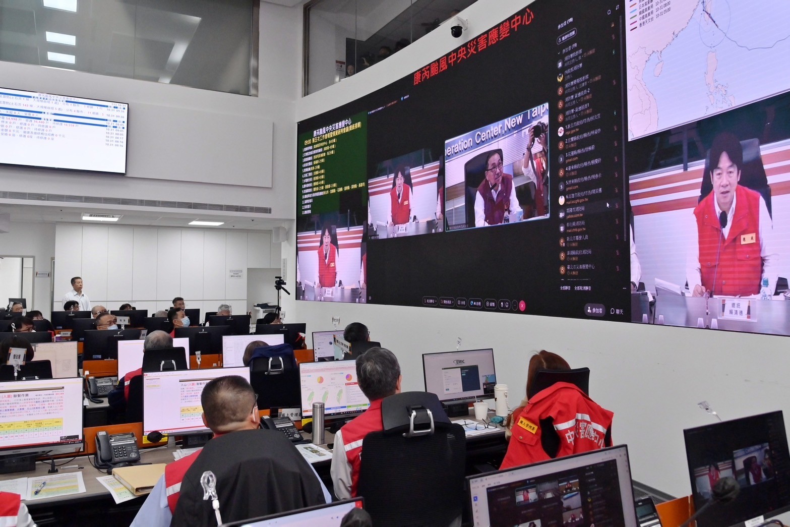 總統與卓院長抵達中央災害應變中心後,首先聽取情資研判組、災情監控及搜索救援組、疏散撤離組、收容安置組、民間組織、交通工程組、水電維生組、農林漁牧組、支援調度組報告,瞭解各功能分組應變整備情形,並與新北市侯友宜市長、宜蘭縣林姿妙縣長、花蓮縣徐榛蔚縣長、臺東縣饒慶鈴縣長、屏東縣周春米縣長及高雄市陳其邁市長進行視訊連線,瞭解地方政府應變整備情形及相關災防需求。