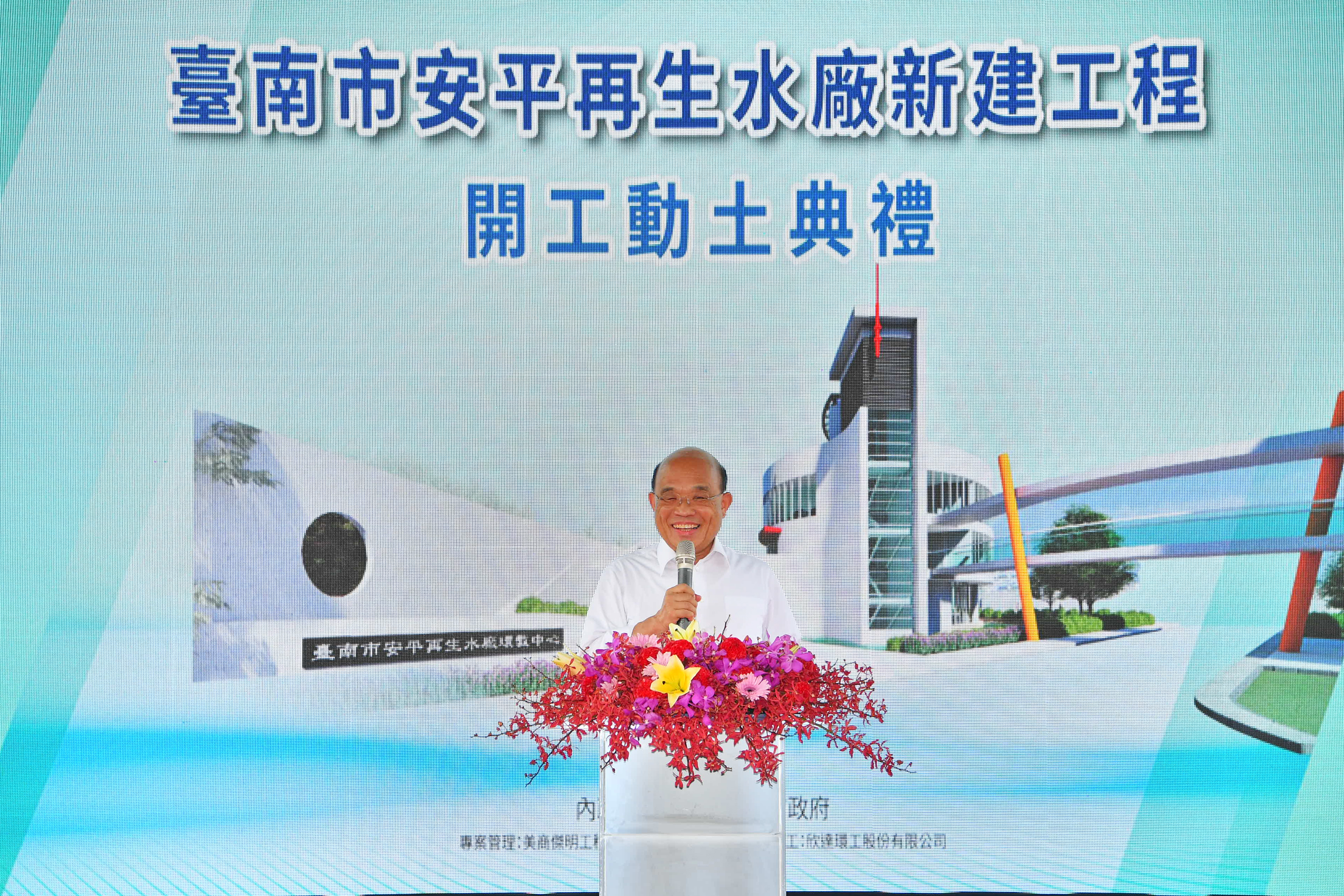 行政院長蘇貞昌今(18)日出席「臺南市安平再生水廠新建工程動土典禮」時表示,「水」是重要物資,滴滴都珍貴,政府不僅要清淤水庫也要有效利用水資源,「有限變無限」,運用科技把污水再生成有用的水。中央補助臺南市永康再生水廠及安平再生水廠超過九成經費約57億,相信中央地方一起努力,讓污水再生成為產業助力!